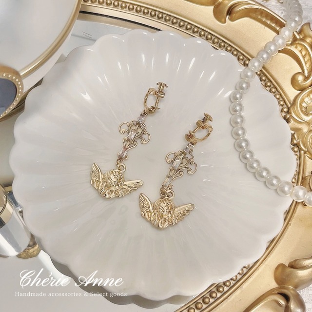 優美で繊細なデザインが特徴的のエンジェルイヤリング。 アンティーク風に仕上げたイヤリングは繊細でありながらもエレガントな印象を与えます。 揺れるチャームにはハートのレリーフが見え隠れするデザインに仕上げました。 まるで天使が恋のいたずらを仕掛けているみたい☆ 存在感のあるアクセサリーで、コーディネートのポイントになること間違いなし。 ワンピースやドレスとの相性も抜群♡ ✦サイズ✦ 横:25mm 縦:45mm(金具含めず) 【変更対応金具について】 ▶︎①ネジバネ式イヤリング(+0円) ▶︎②ネジバネ式イヤリング シリコンカバー付き(+50円) ▶︎③フックピアス(+0円) ▶︎④スタッドピアス(+70円) ▶︎⑤樹脂ノンホールピアス(+60円) ▶︎⑥フープイヤリング(フェイクピアス)(+150円) イヤリング、ピアス金具の変更をご希望の方は購入オプション欄よりプルダウンで選択してください。 ※選択のない場合は①ネジバネ式イヤリング(+0円)で発送いたします。