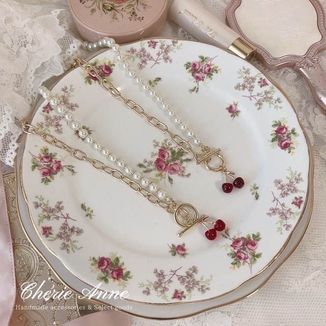 深紅のチェリーがあしらわれた、華やかで可愛らしいネックレス。 チェーンとパールがアクセントになっていて、どんなコーディネートにも一層華やかさをプラスしてくれます。 シンプルなコーデにプラスするだけで、トレンド感のあるスタイリングが完成します。 ✦サイズ✦ 長さ:43.5cm うち留め具部分:2.5cm