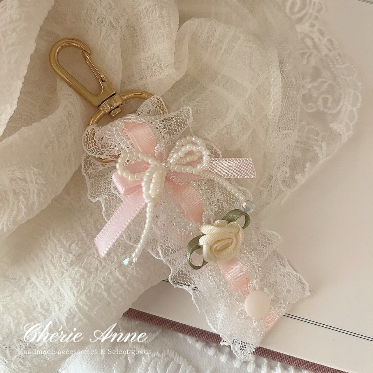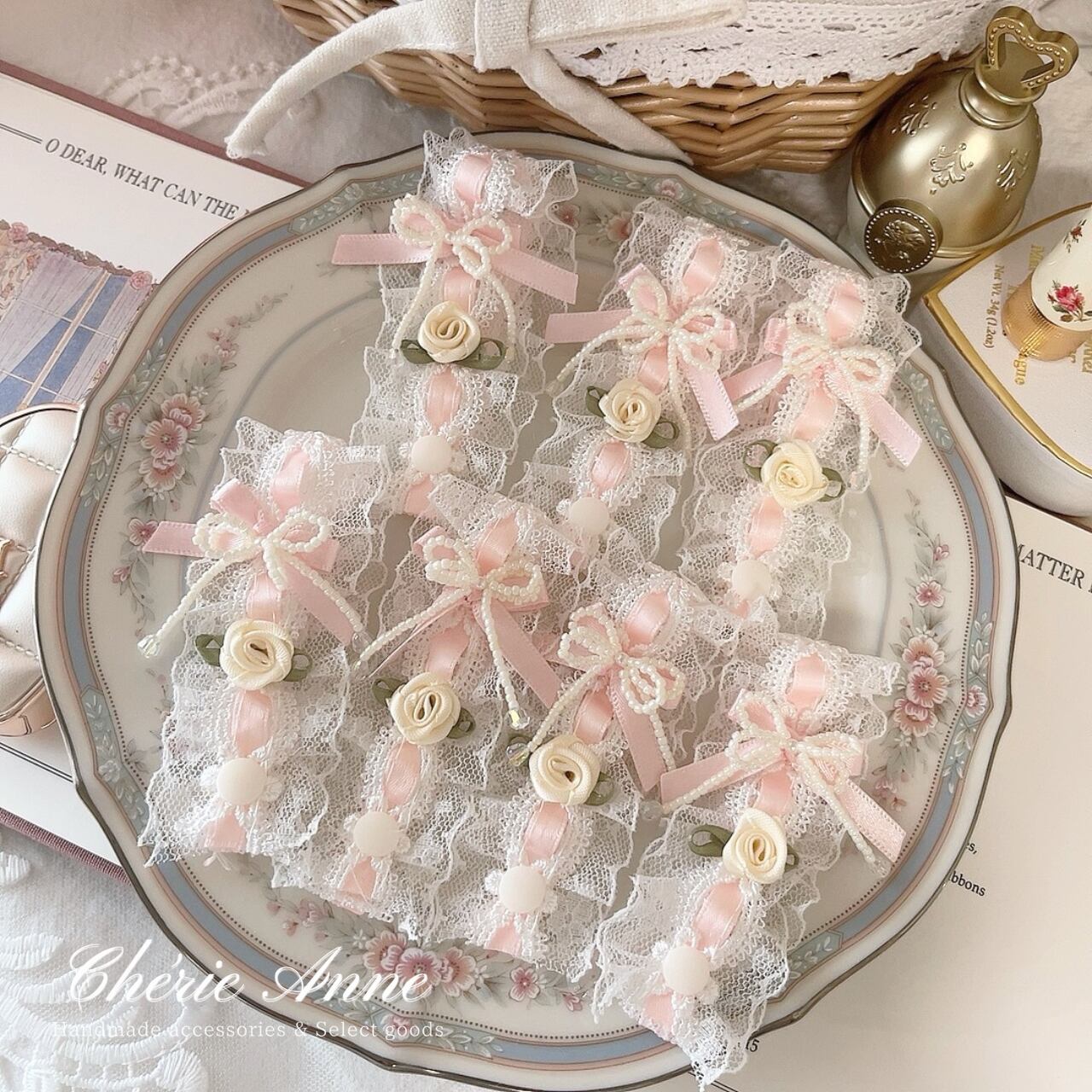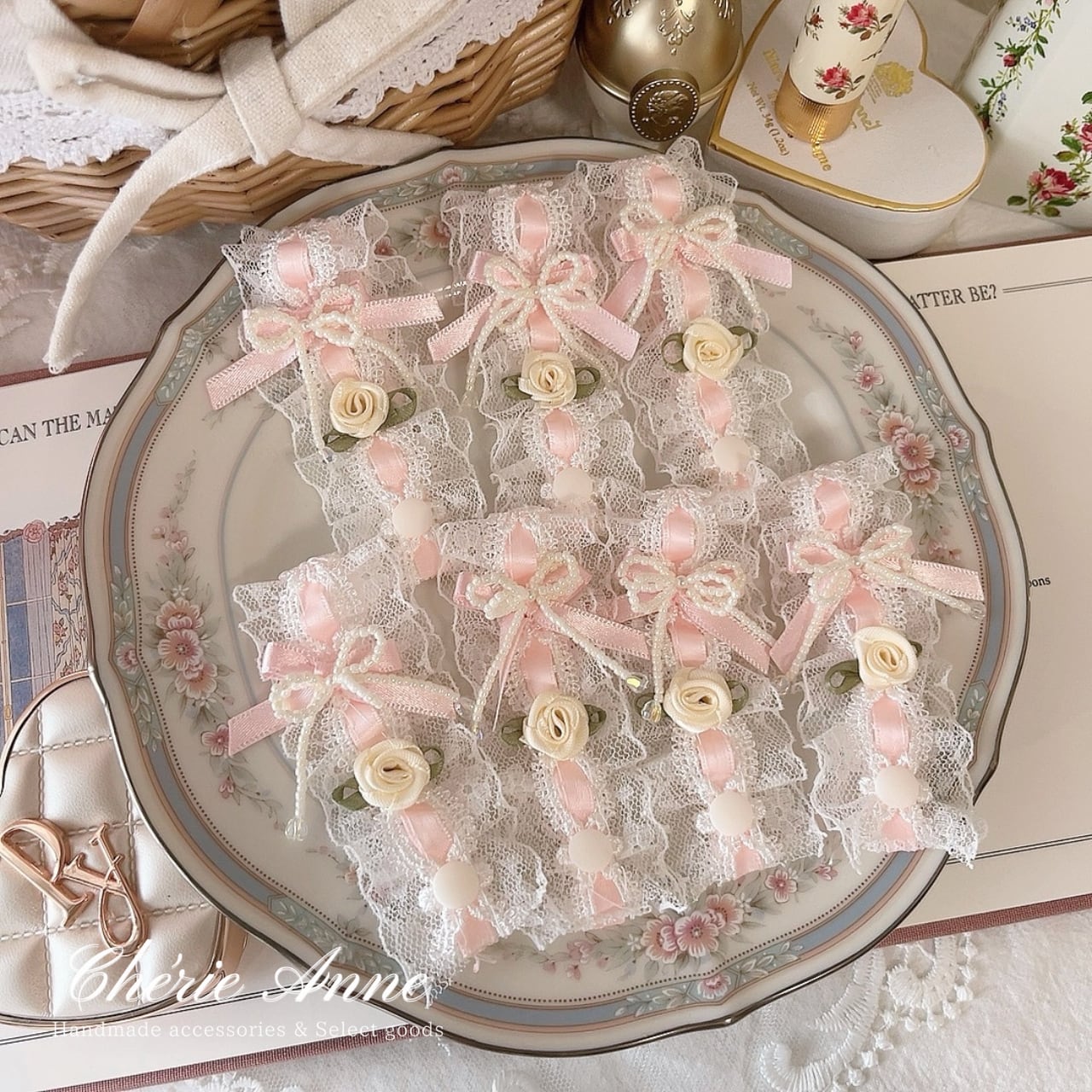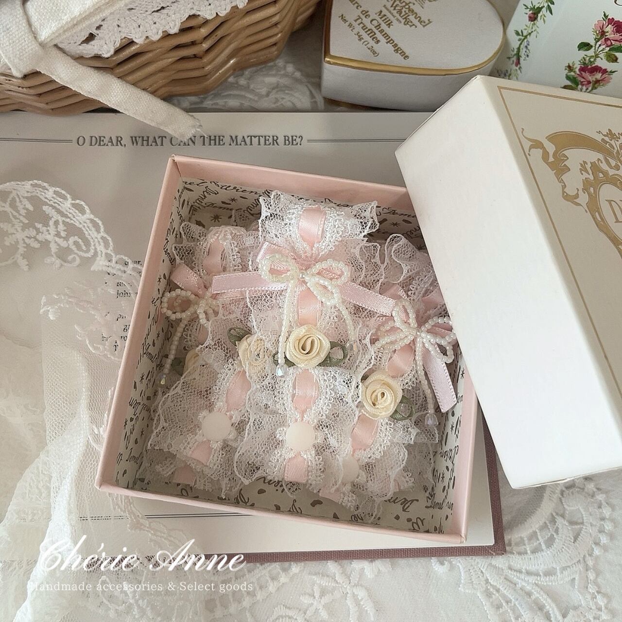 淡いピンクカラーのレースにビーズで作られたリボン、お花はまるで薔薇の香りを運んでくれるよう。