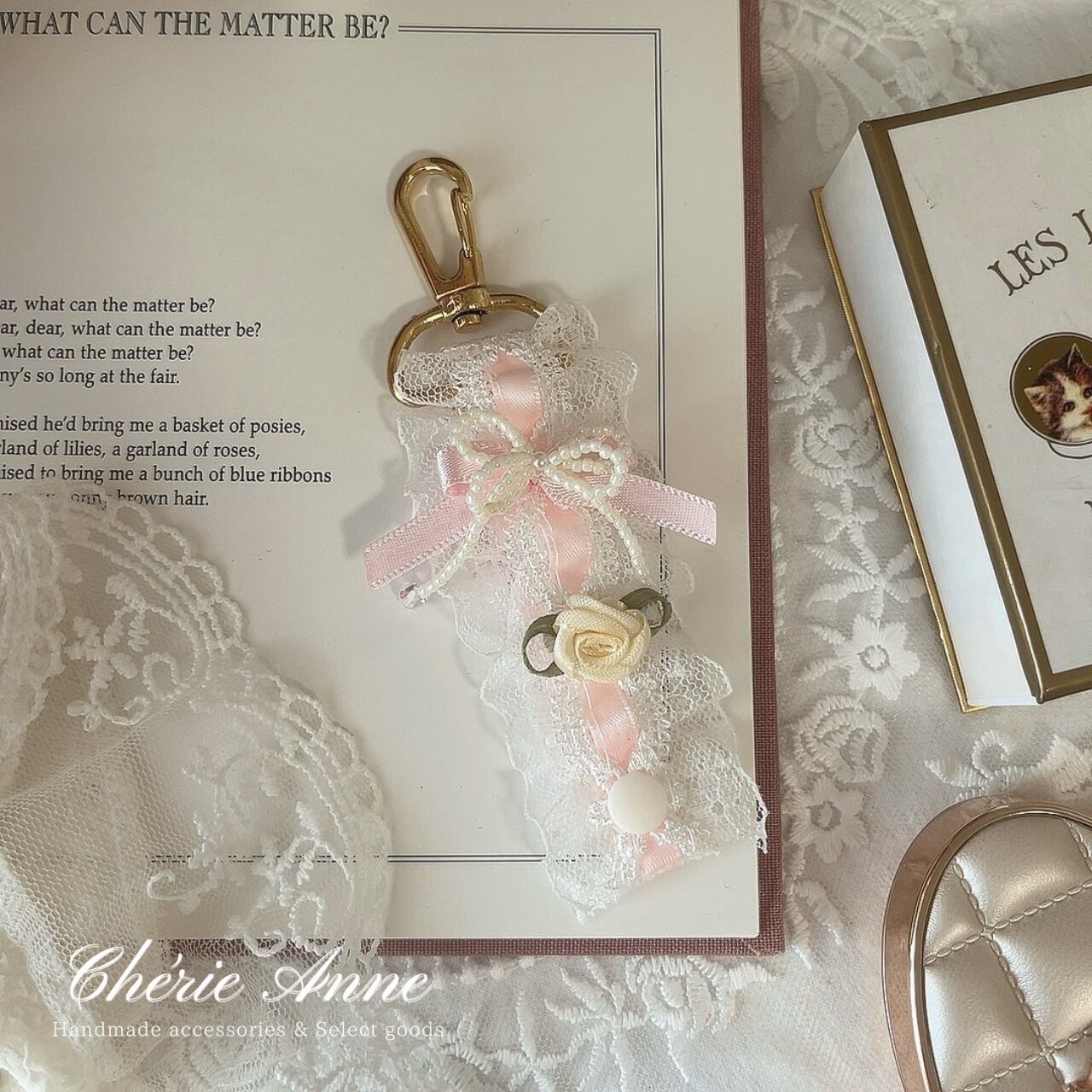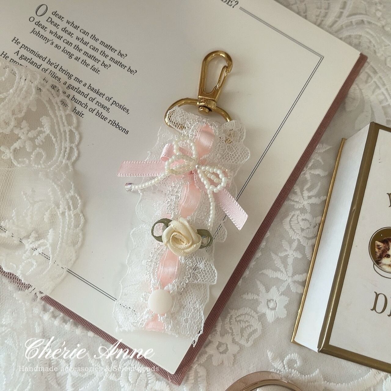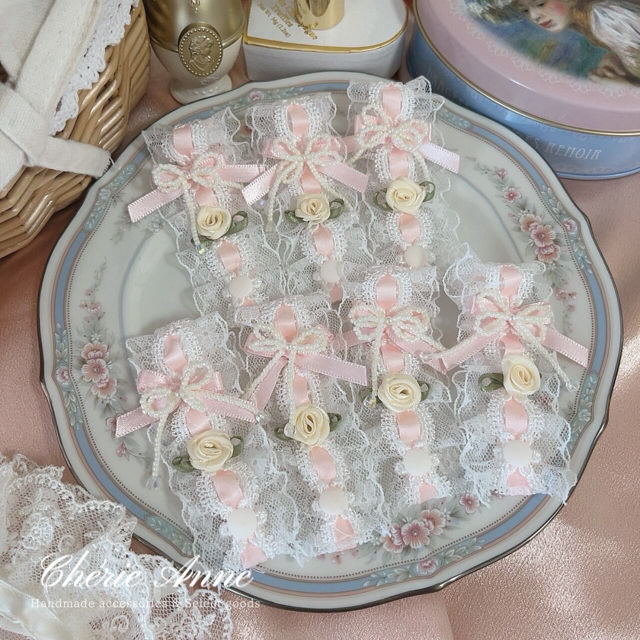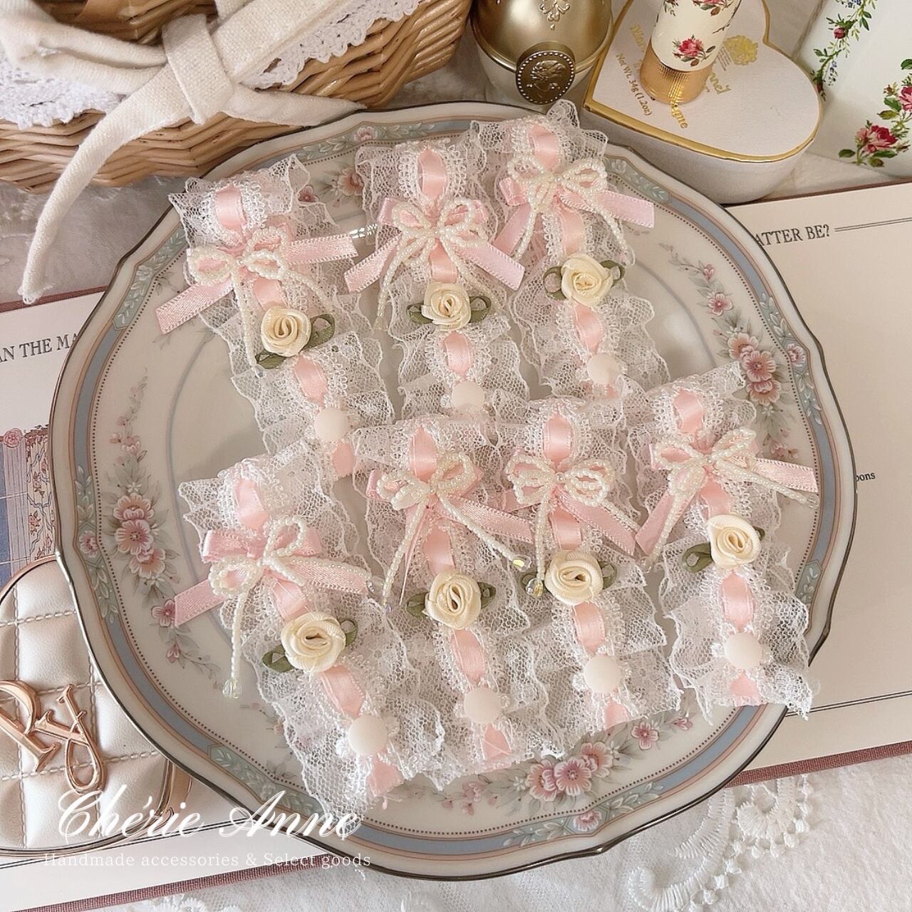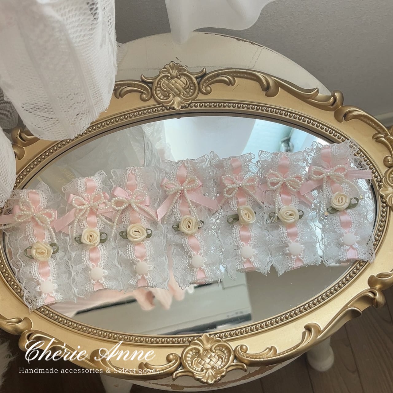 淡いピンクカラーのレースにビーズで作られたリボン、お花はまるで薔薇の香りを運んでくれるよう。