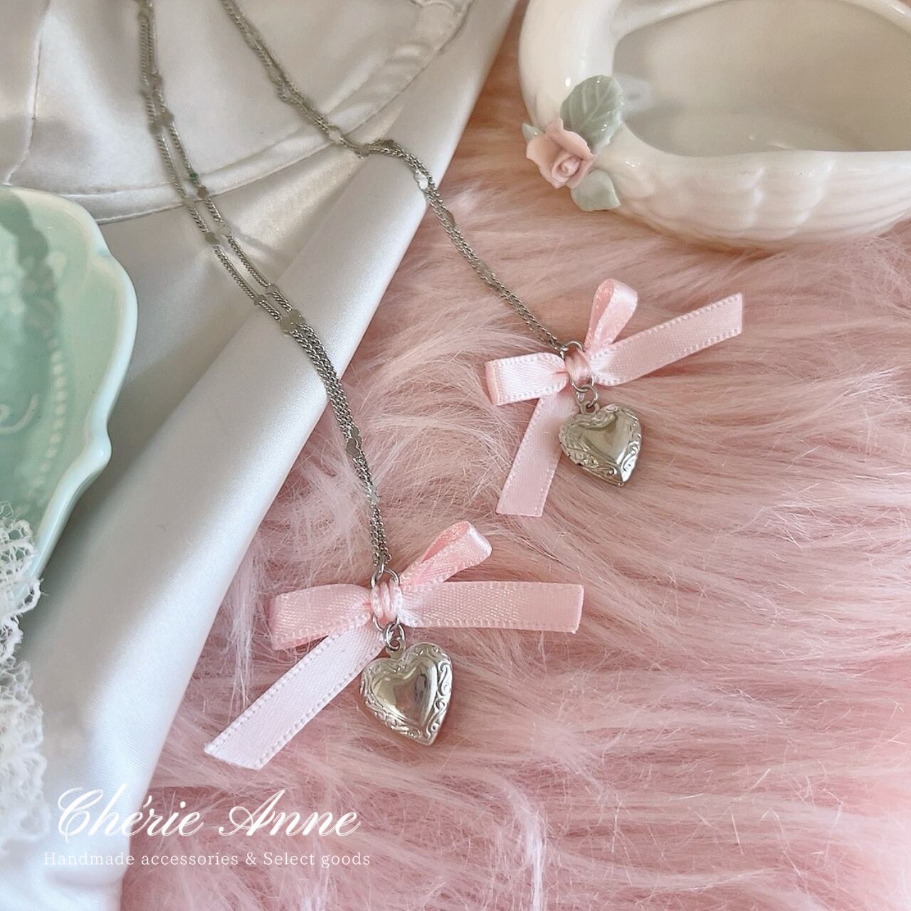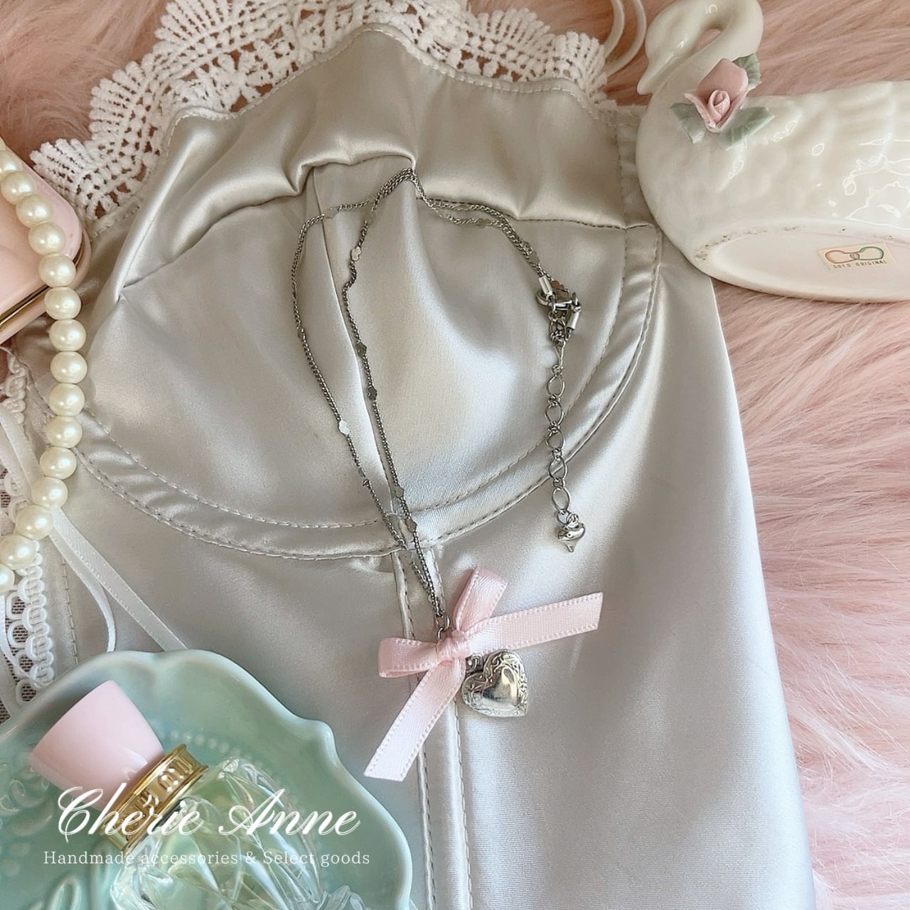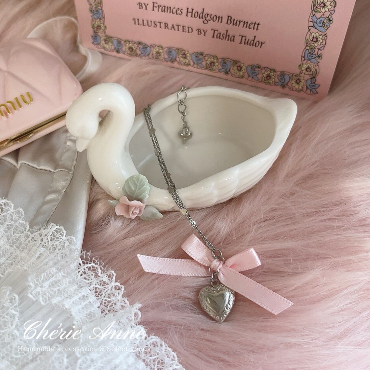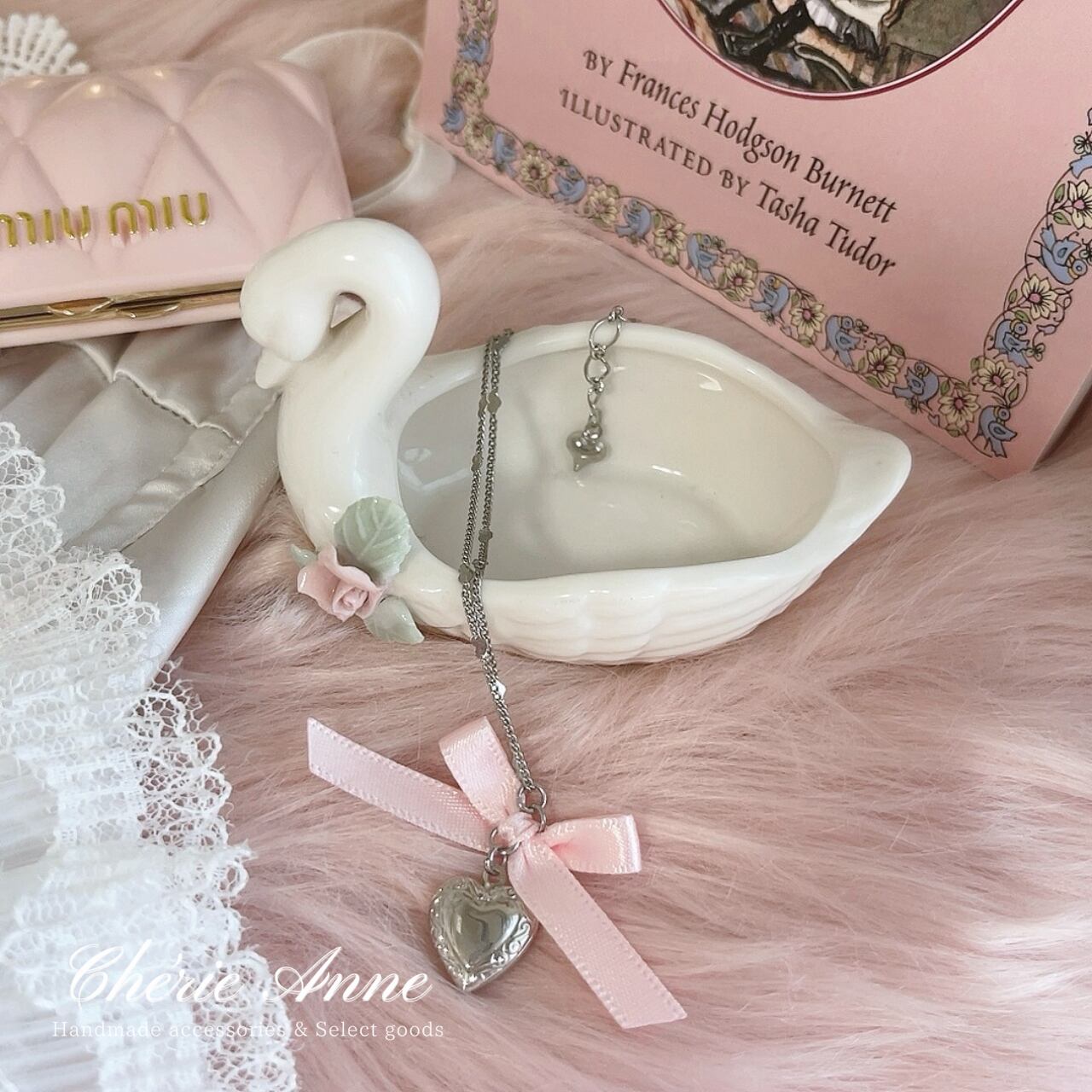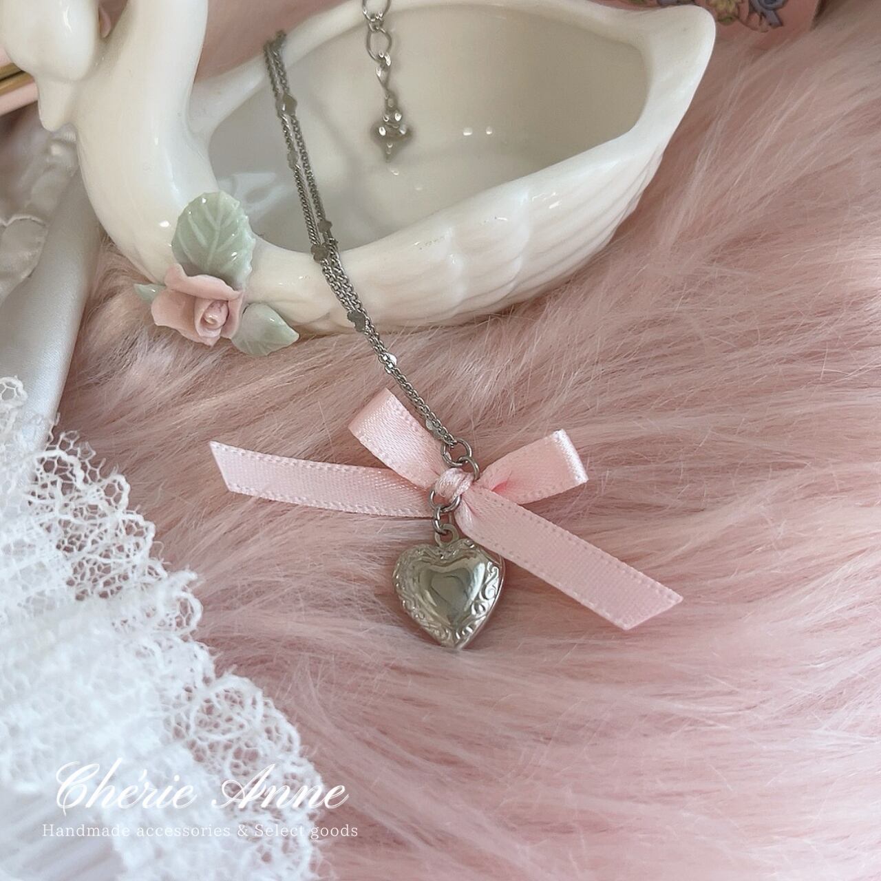 クラシックなハートのロケットと可憐なリボンが、胸元に可愛らしさを添え、どんな装いにもエレガントなアクセントを加えます。