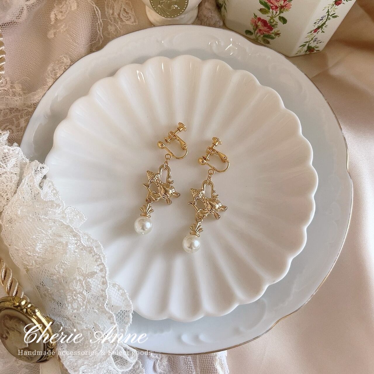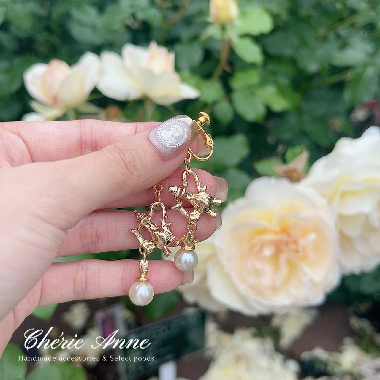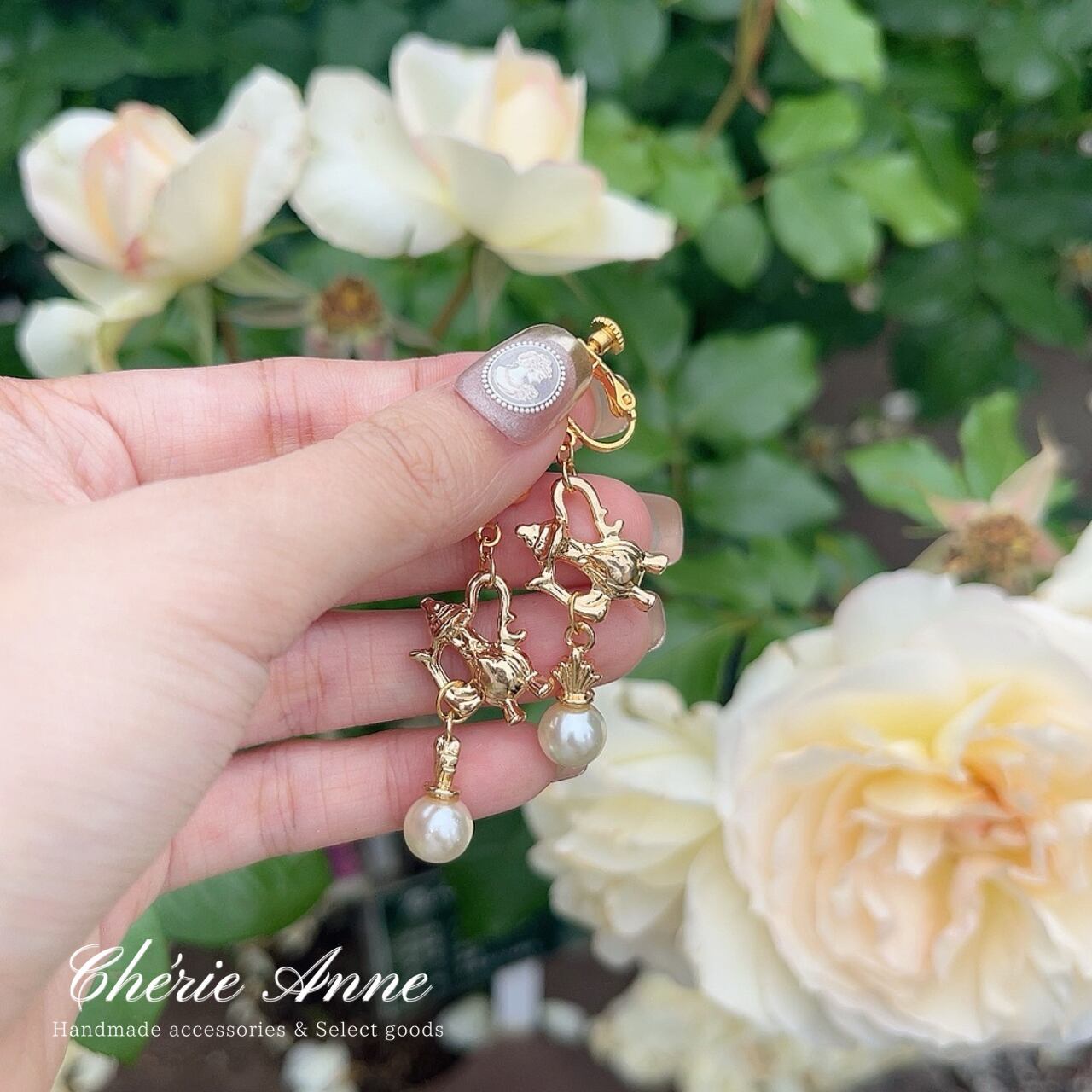 ローズガーデンのティーパーティーをテーマにしたイヤリングです。