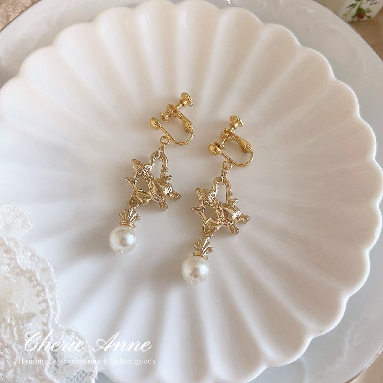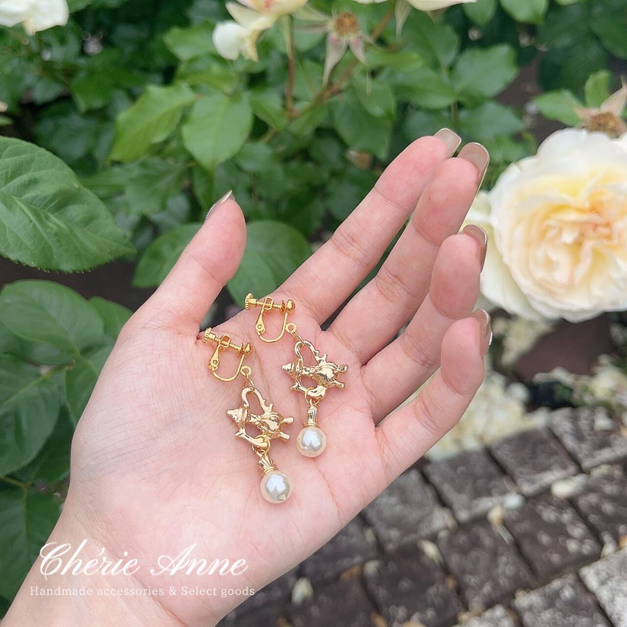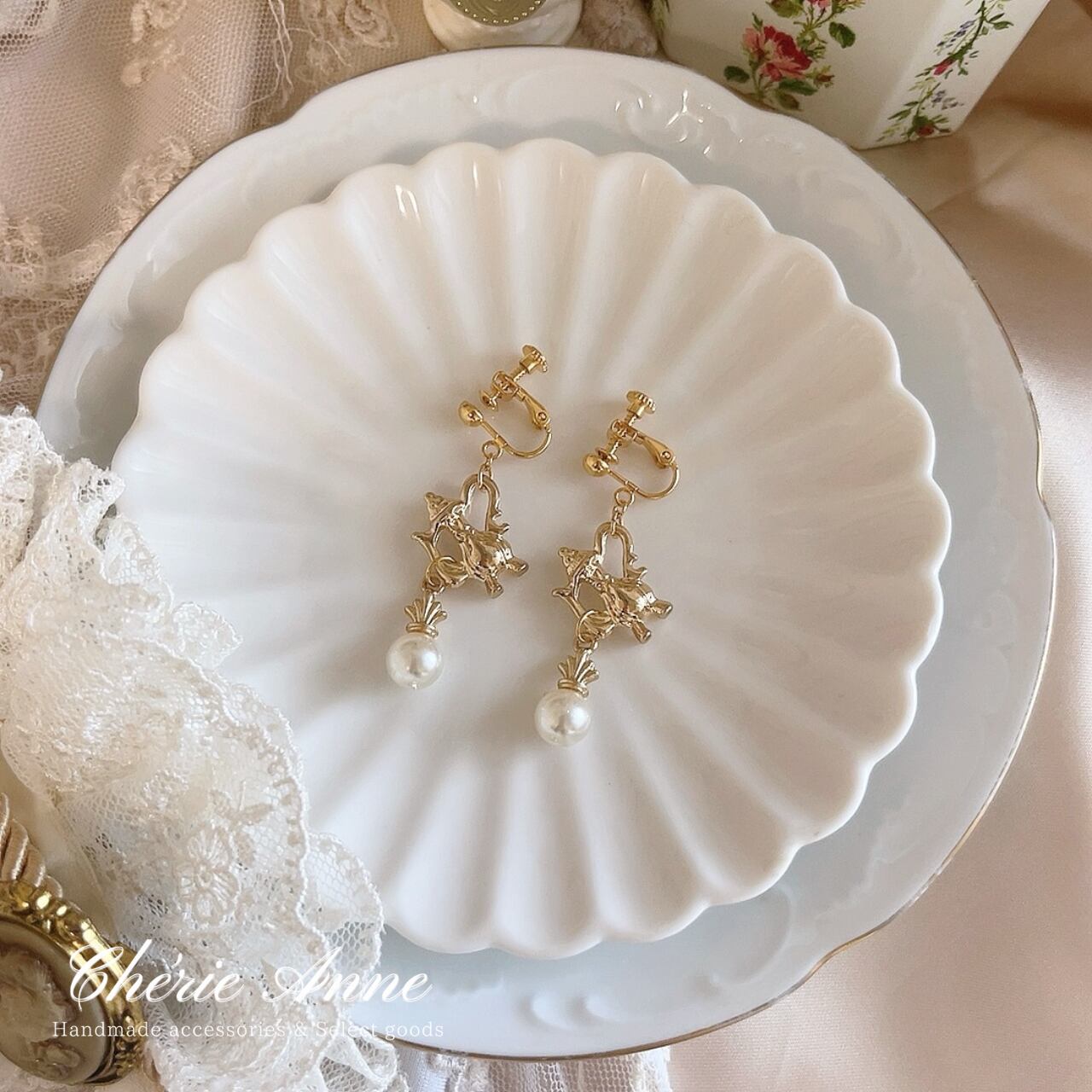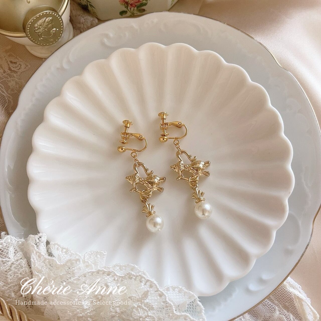 ローズガーデンのティーパーティーをテーマにしたイヤリングです。