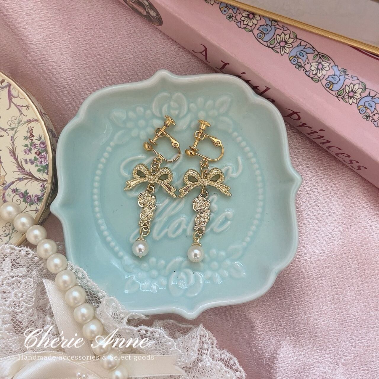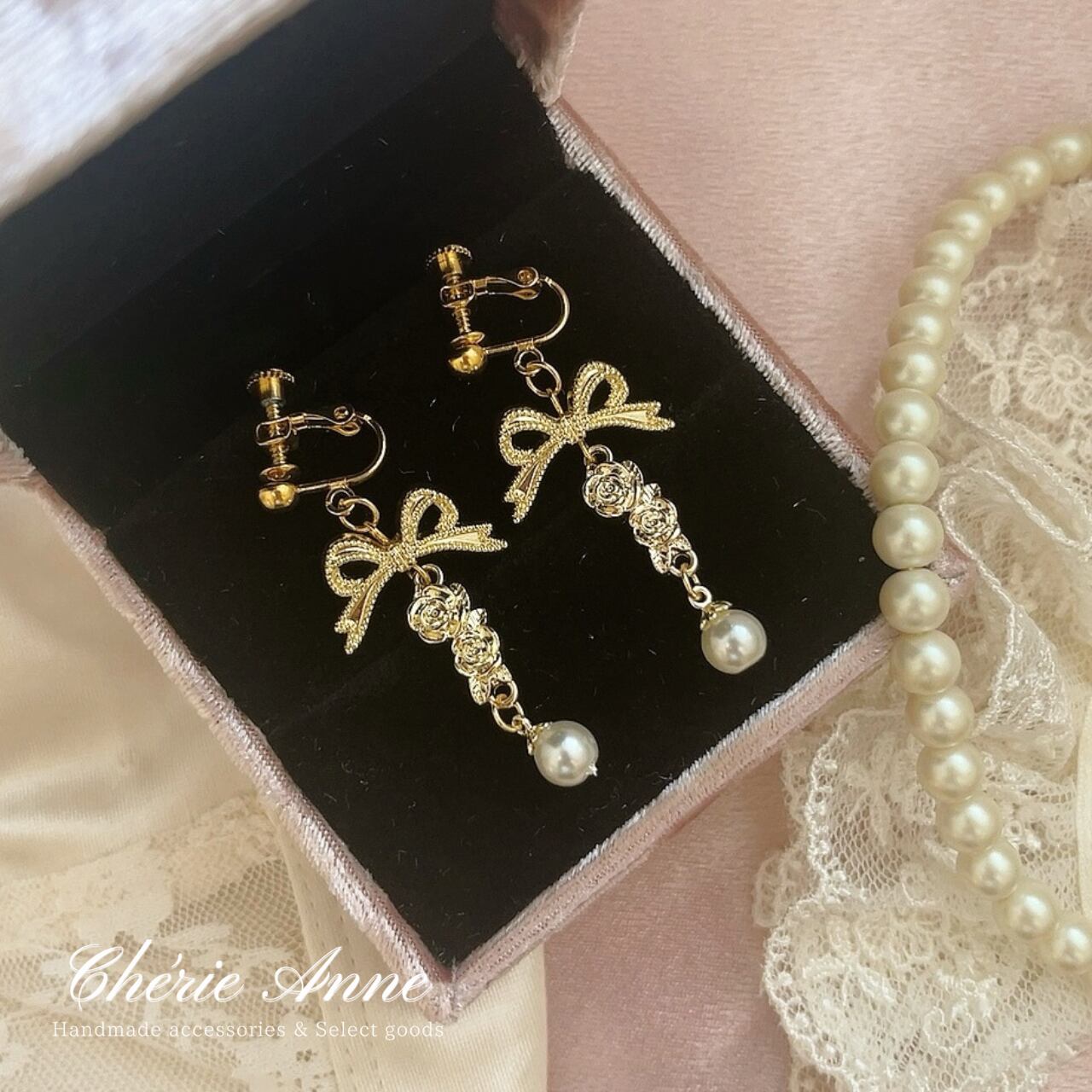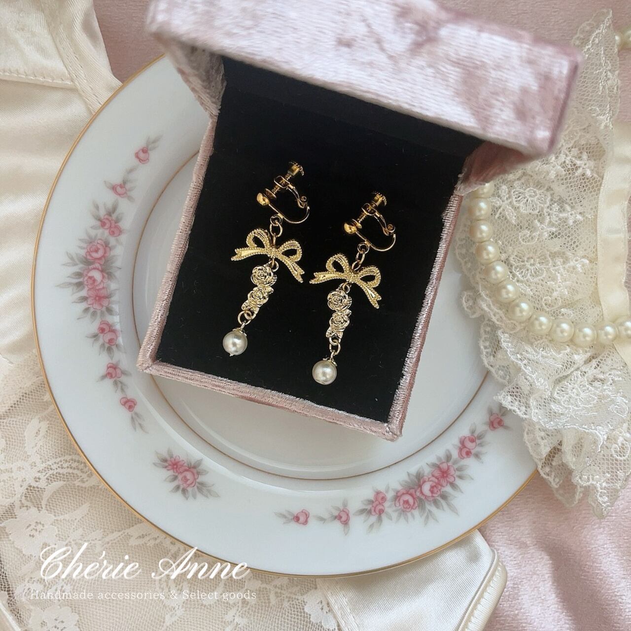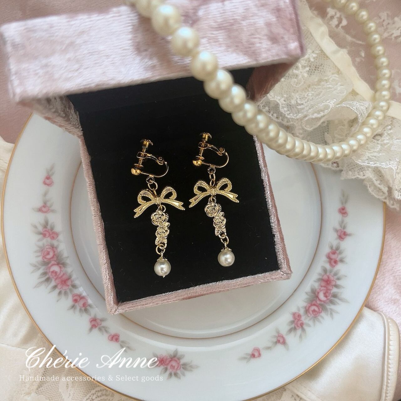 リボン、ローズ、そしてパールが織り成す絶妙なハーモニーで、揺れるたびに視線を一人占め。