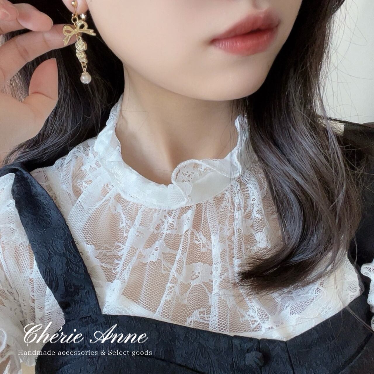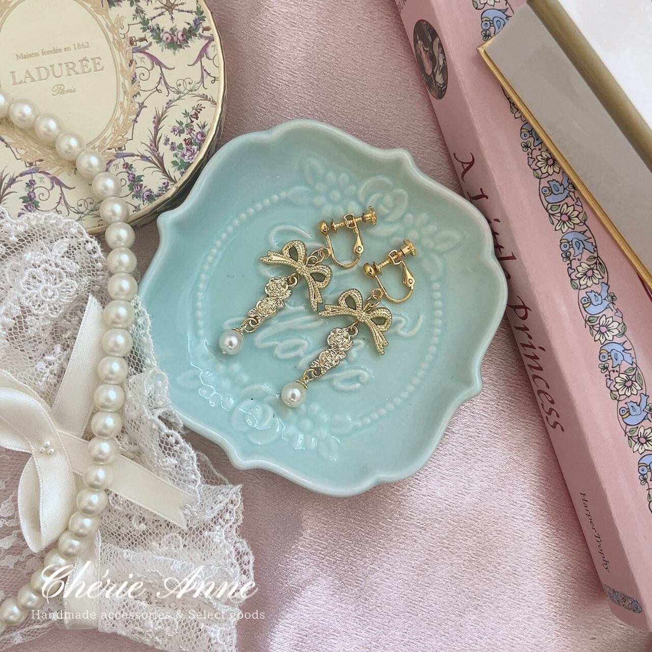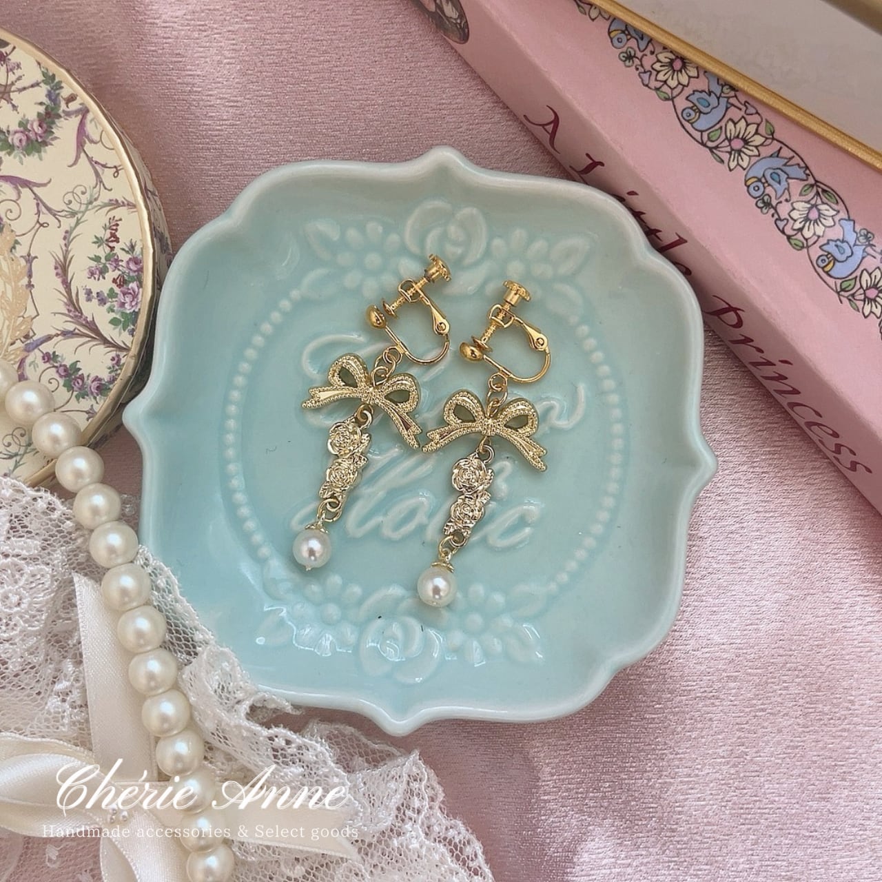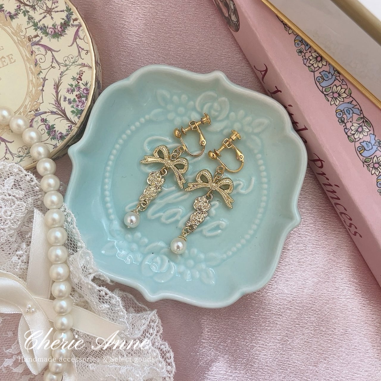 リボン、ローズ、そしてパールが織り成す絶妙なハーモニーで、揺れるたびに視線を一人占め。