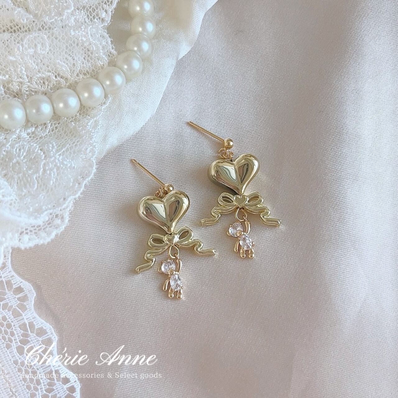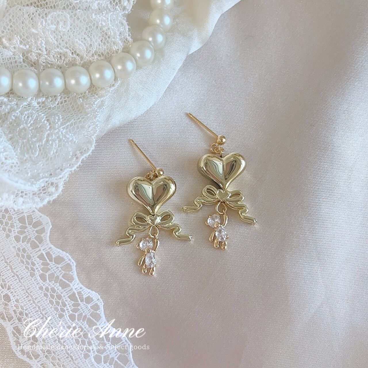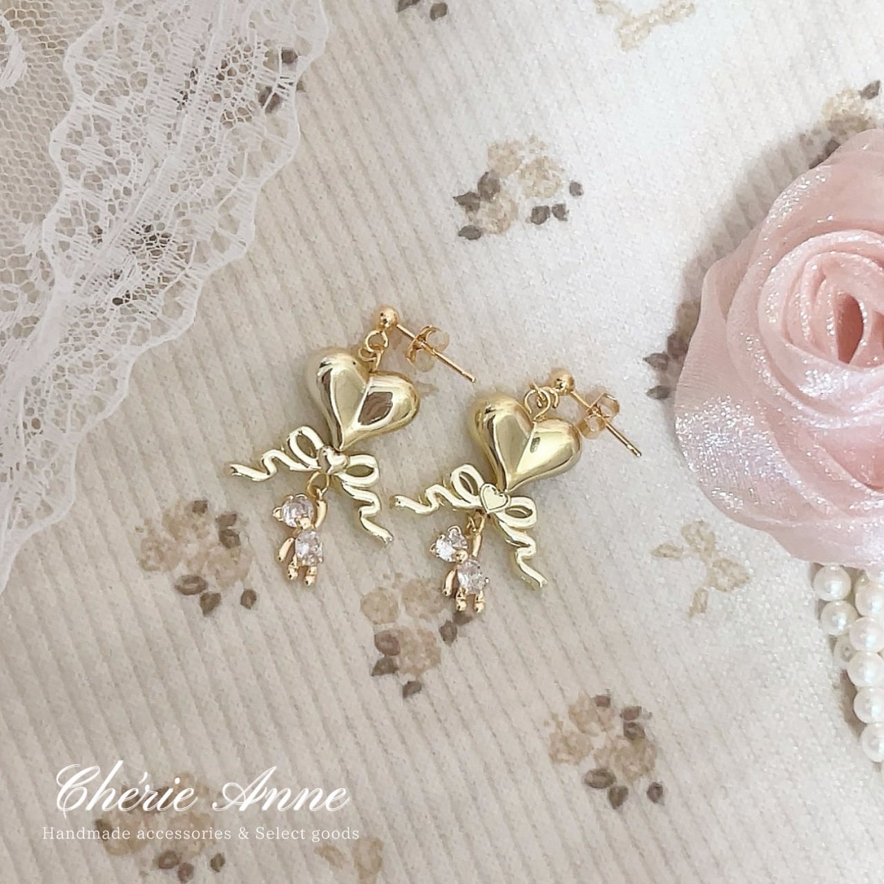 風船に見立てたハートとリボンに、手を伸ばす愛らしいテディベアがキュートな輝きを放つイヤリングです。
