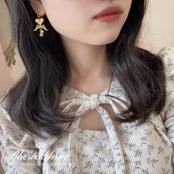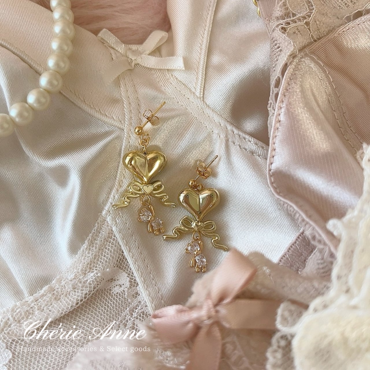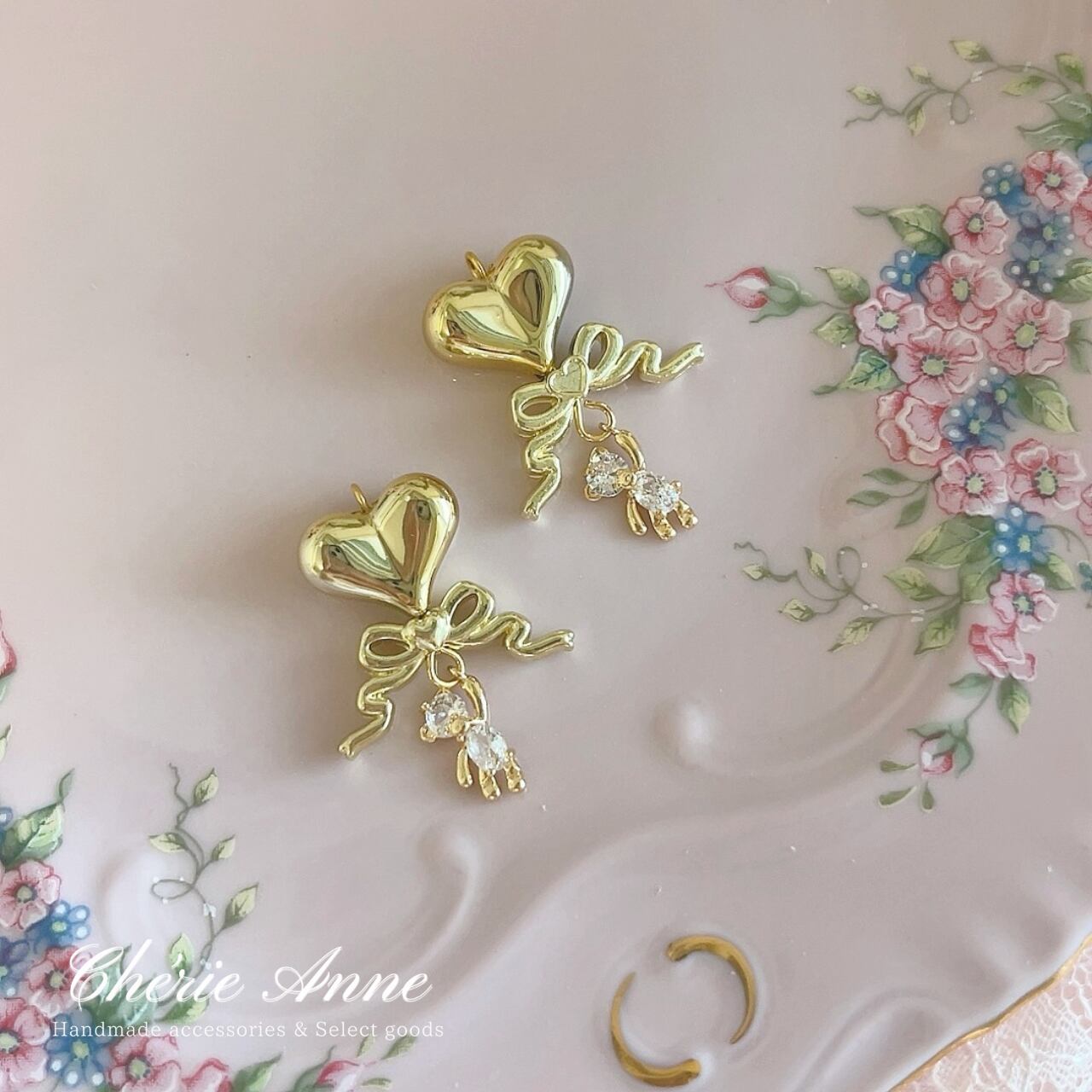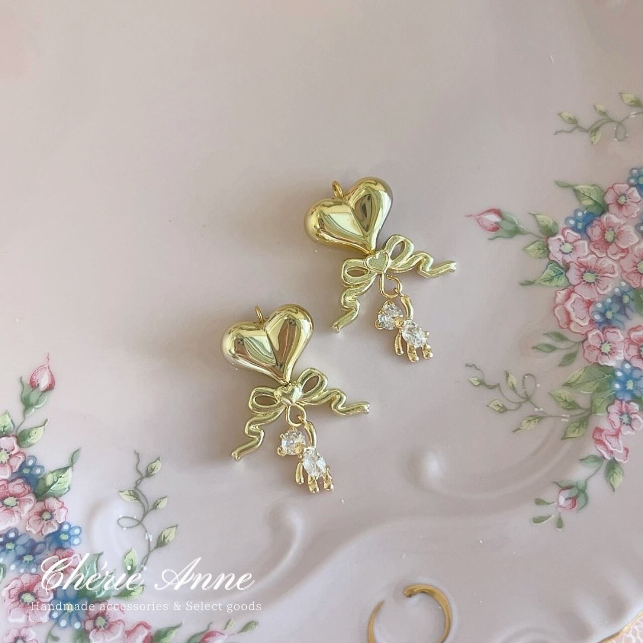 風船に見立てたハートとリボンに、手を伸ばす愛らしいテディベアがキュートな輝きを放つイヤリングです。