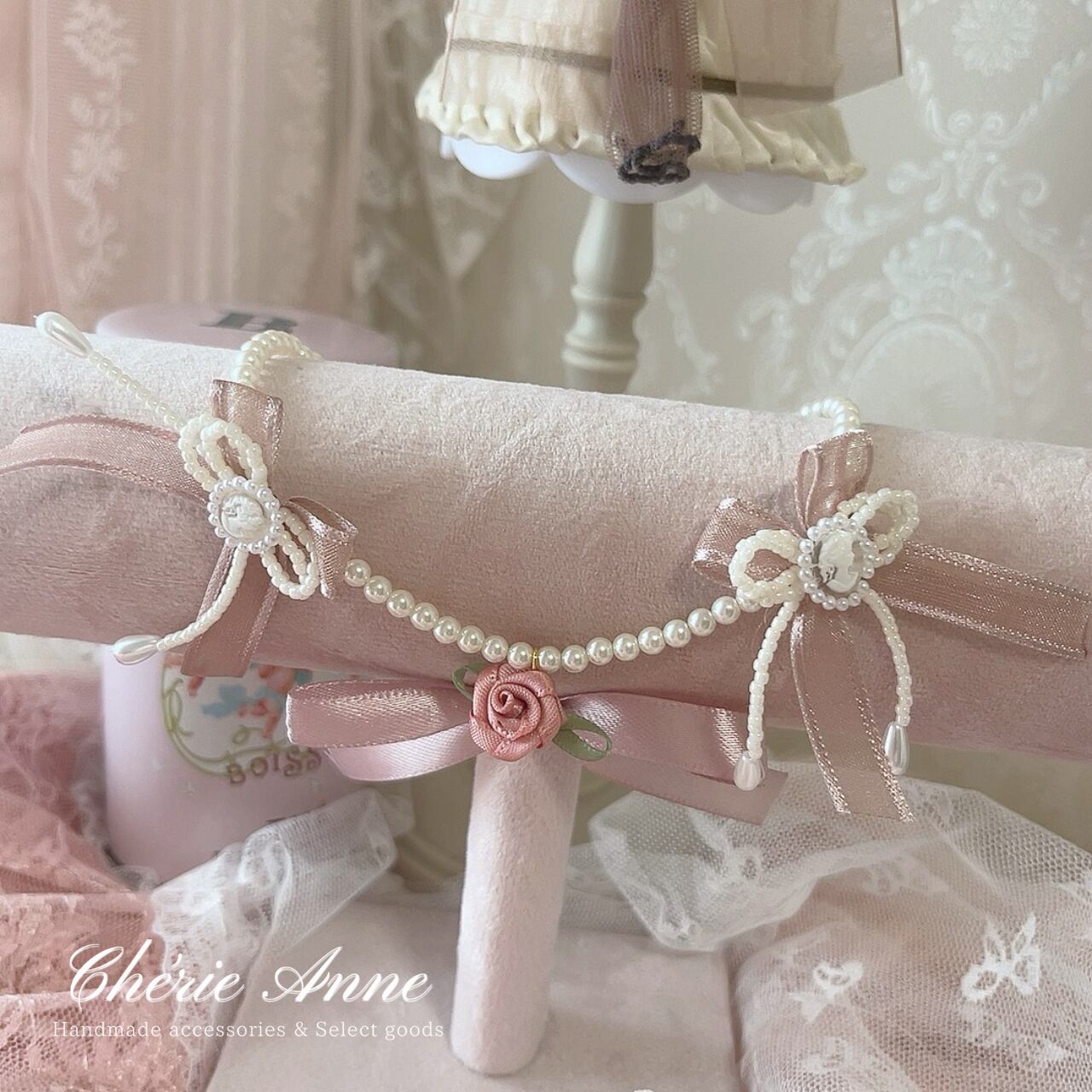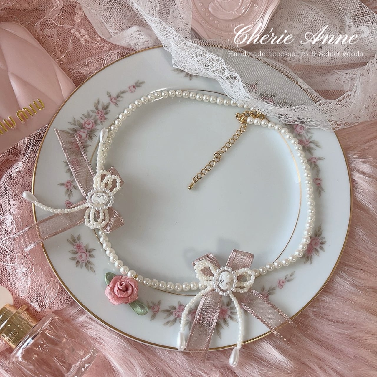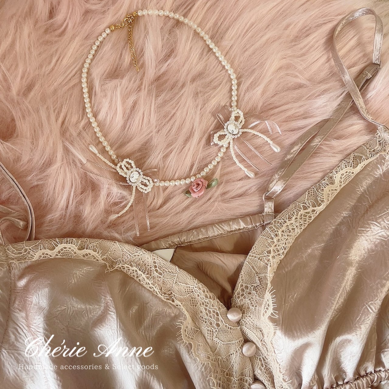 繊細なパールネックレスにリボンと薔薇が華やかに絡み合い、まるで夢の中にいるかのようなロマンティックなデザインに仕上げました。