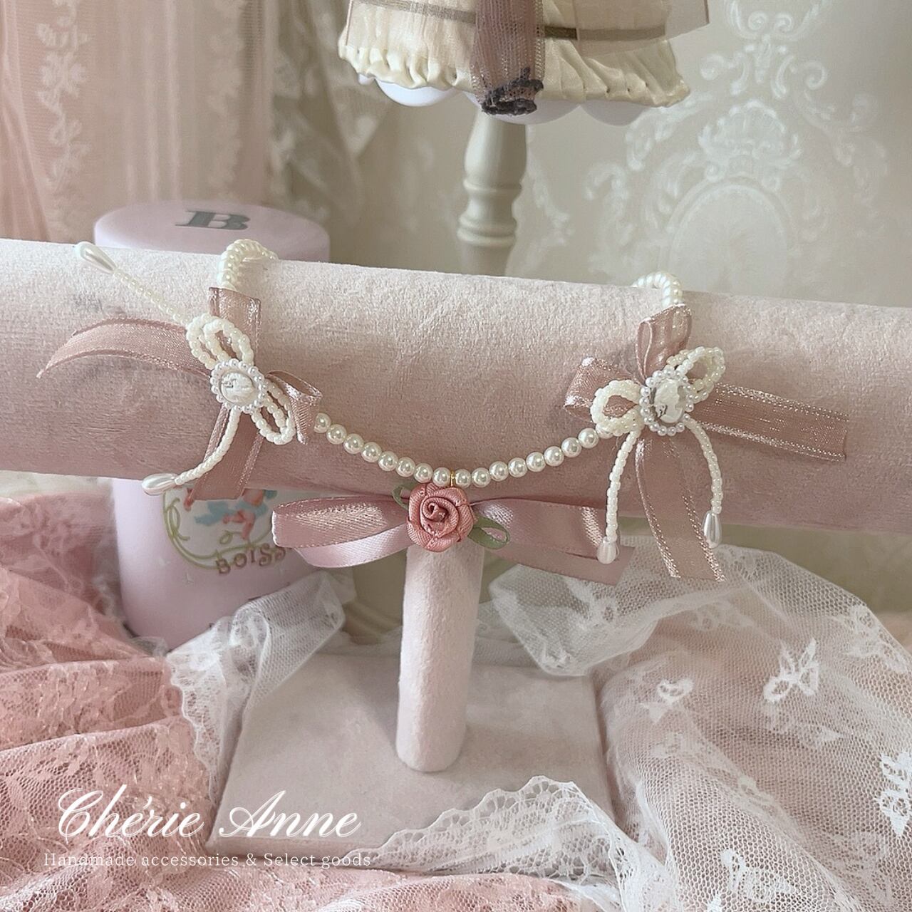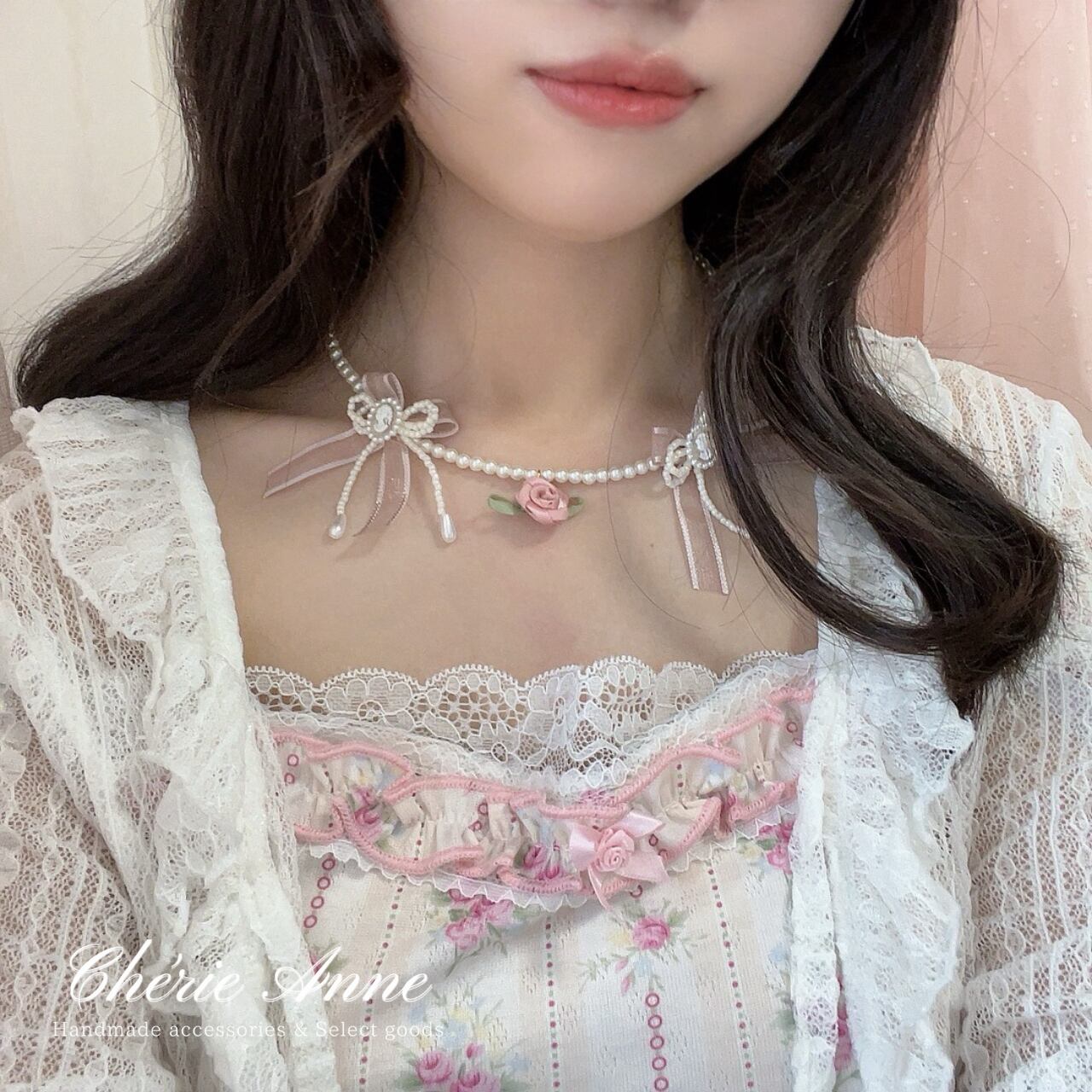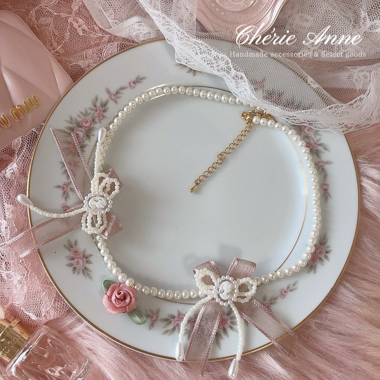 繊細なパールネックレスにリボンと薔薇が華やかに絡み合い、まるで夢の中にいるかのようなロマンティックなデザインに仕上げました。