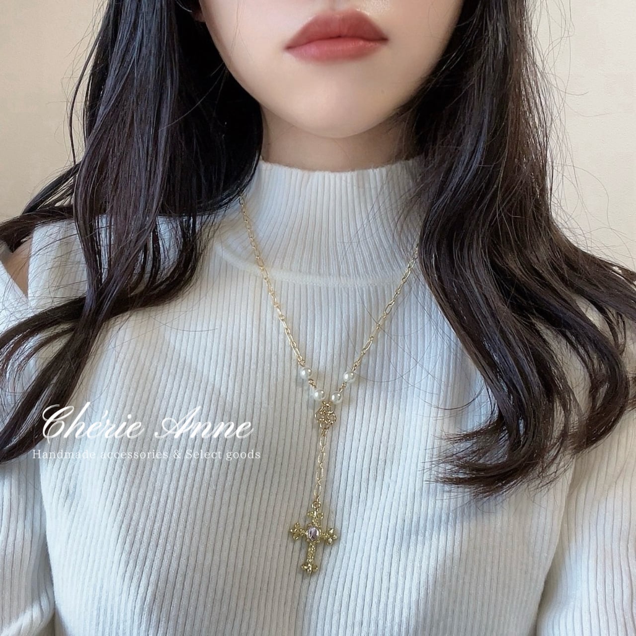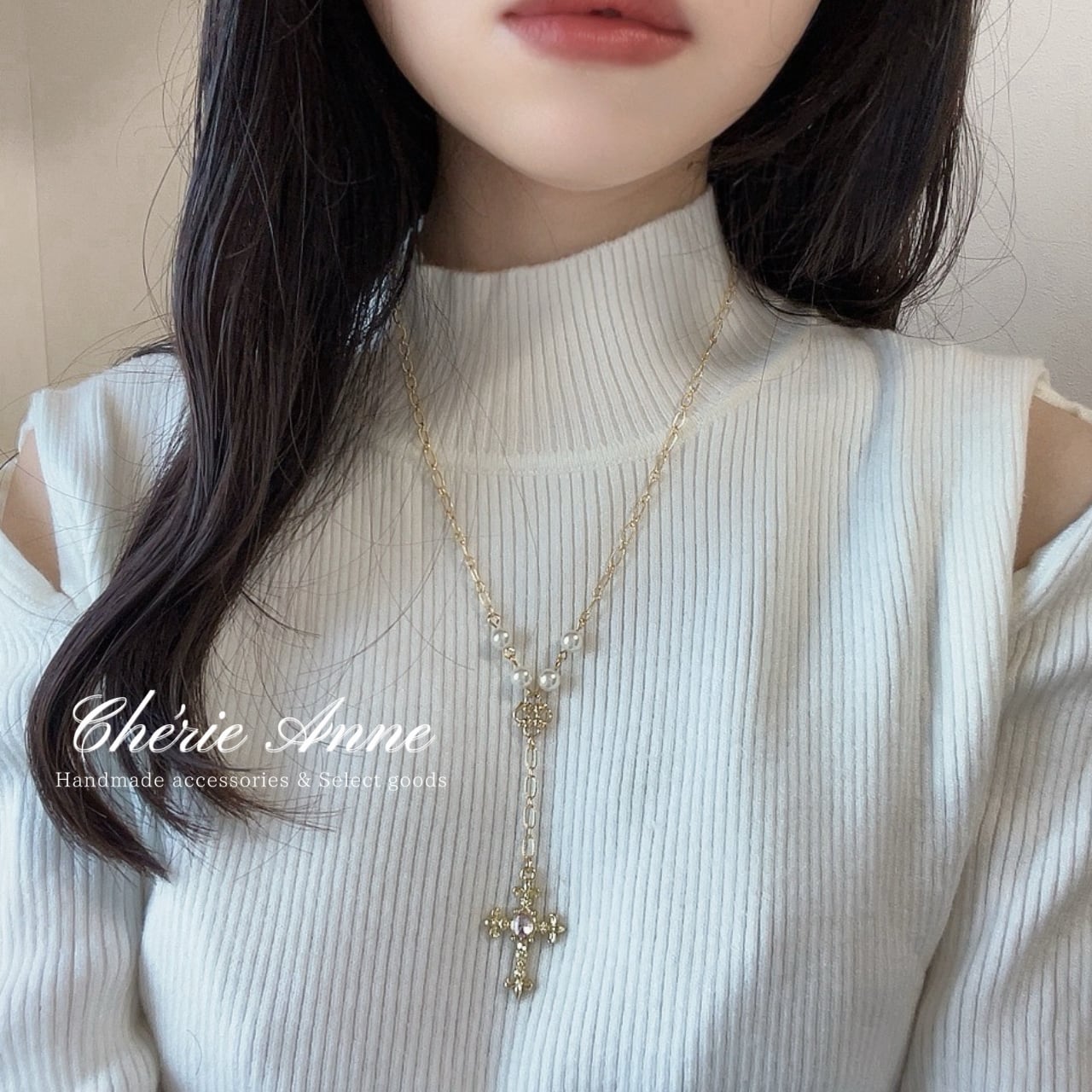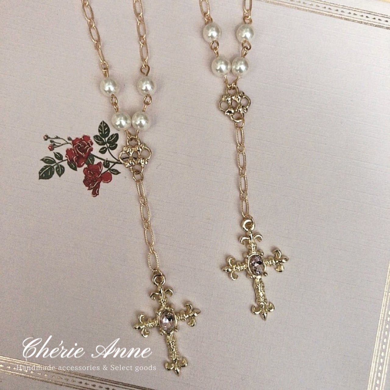 繊細なチェーンに揺れる十字架が華を添え、どこか懐かしくも新しい雰囲気を醸し出します。