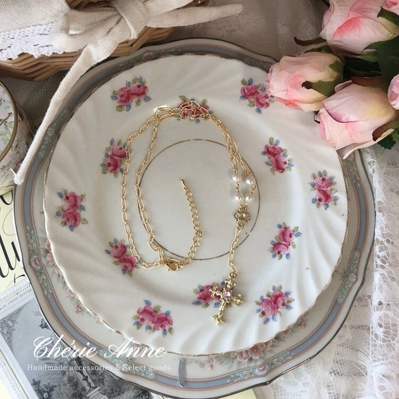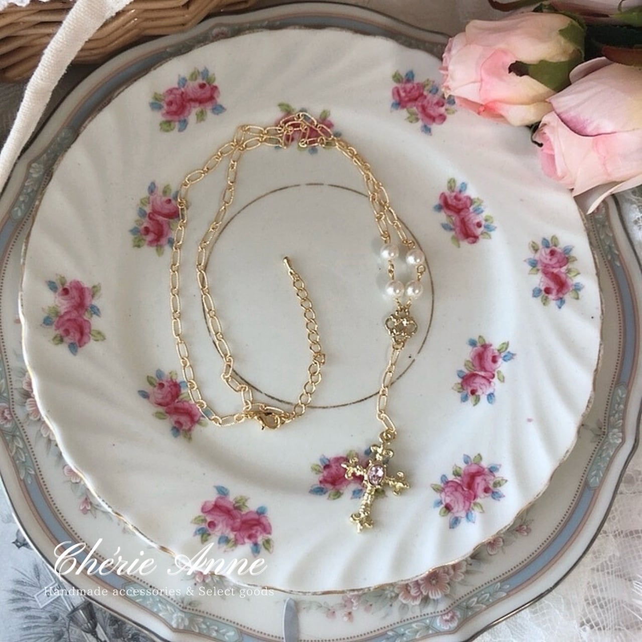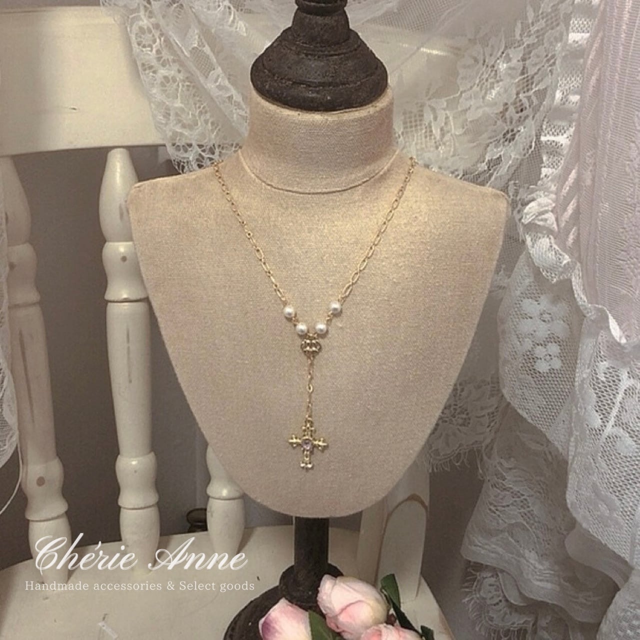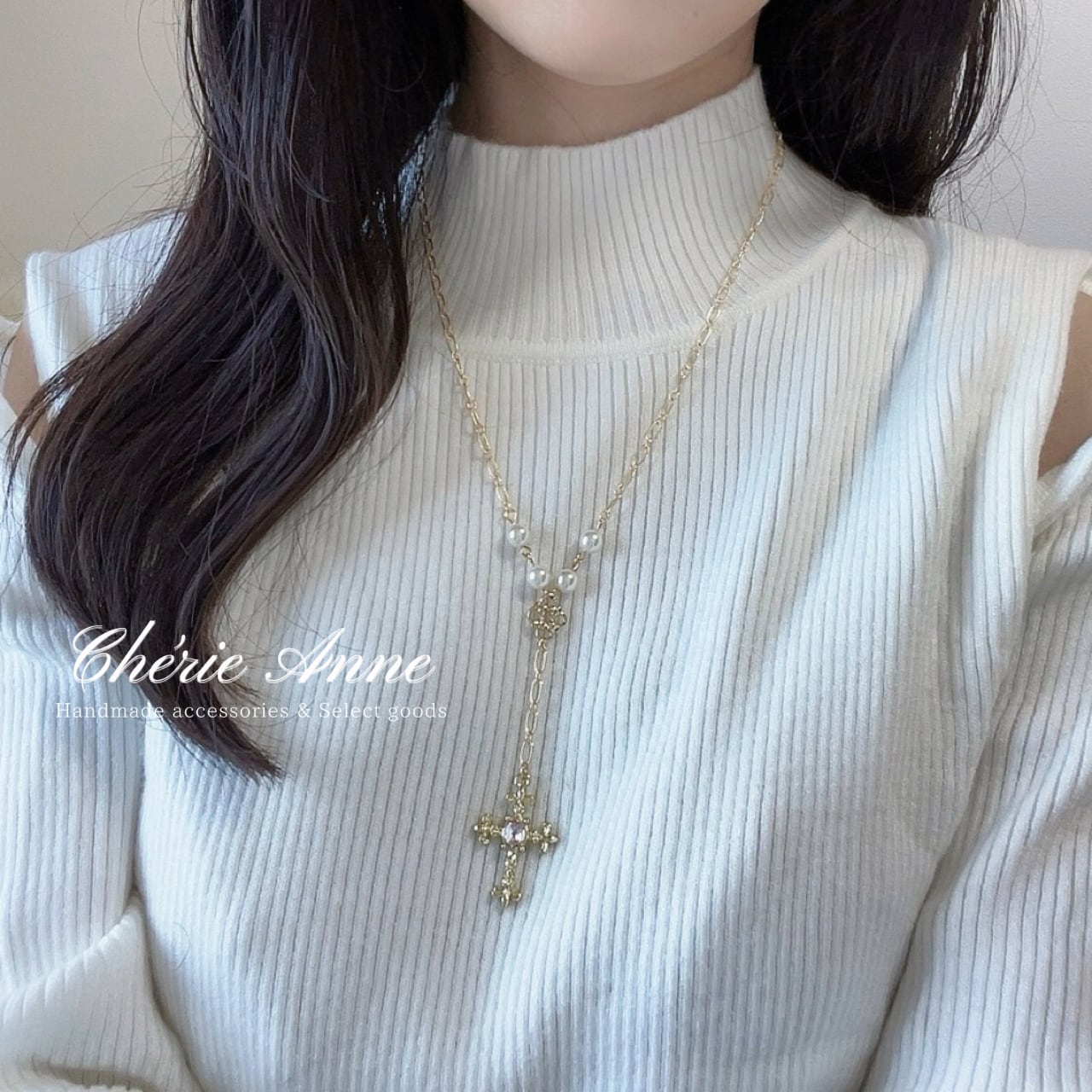 繊細なチェーンに揺れる十字架が華を添え、どこか懐かしくも新しい雰囲気を醸し出します。