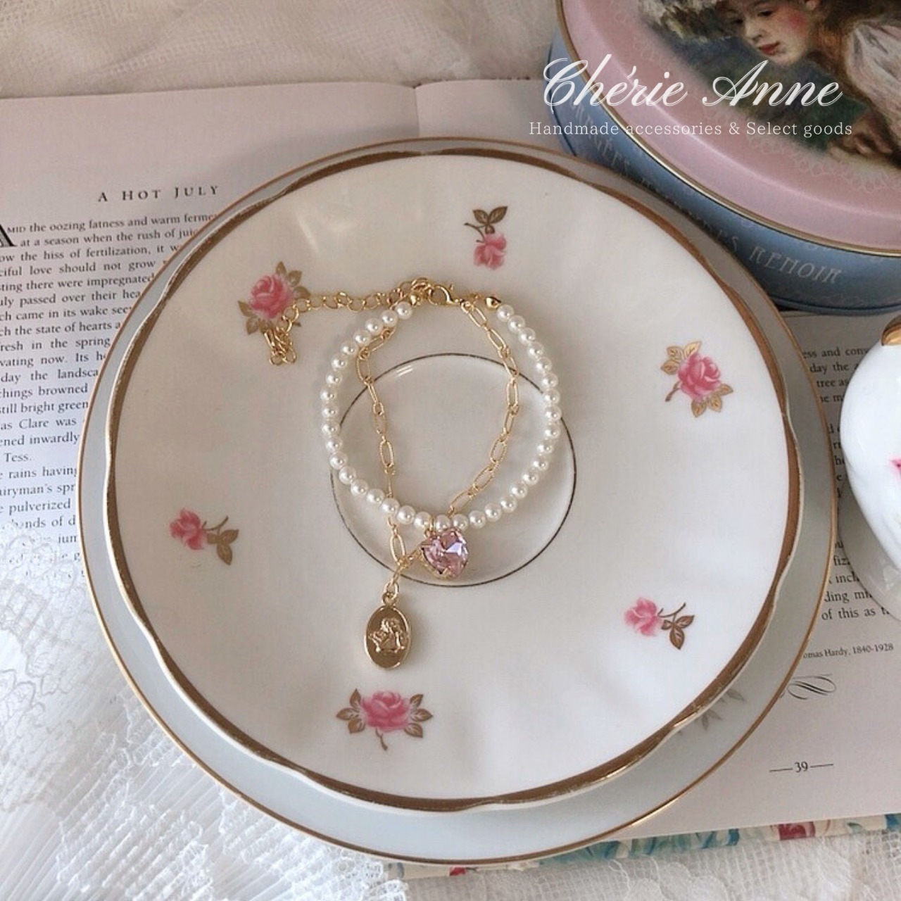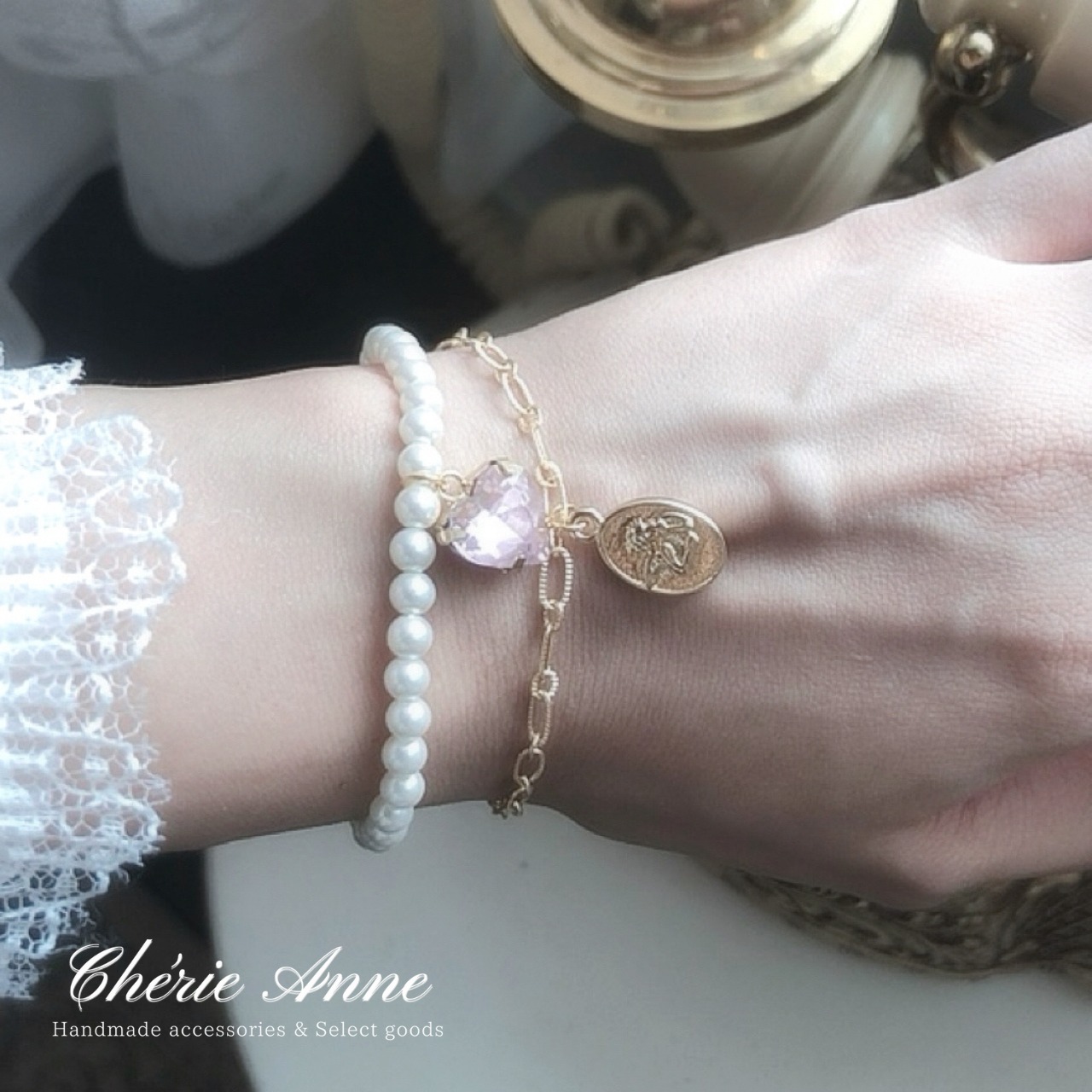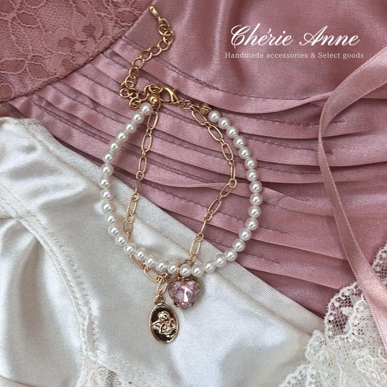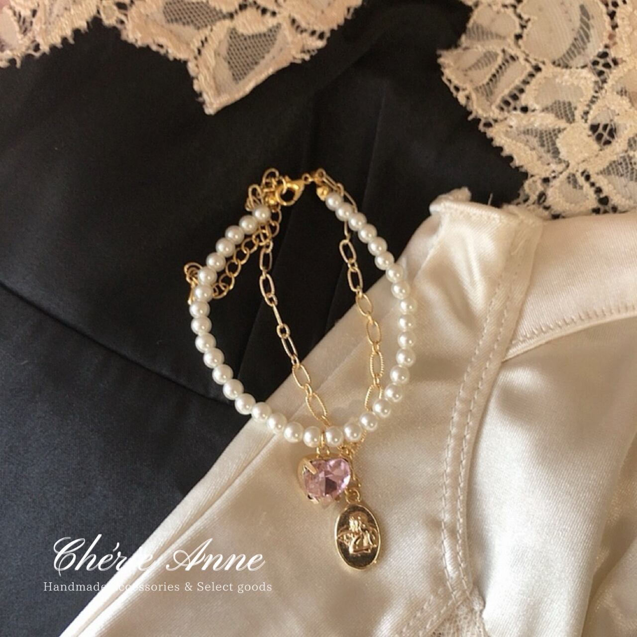 パールとチェーンが織りなすエンジェルハートブレスレット。