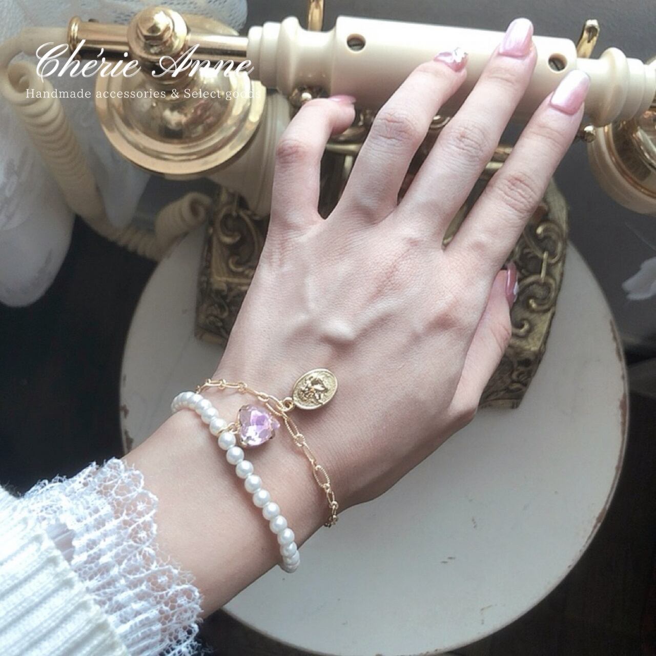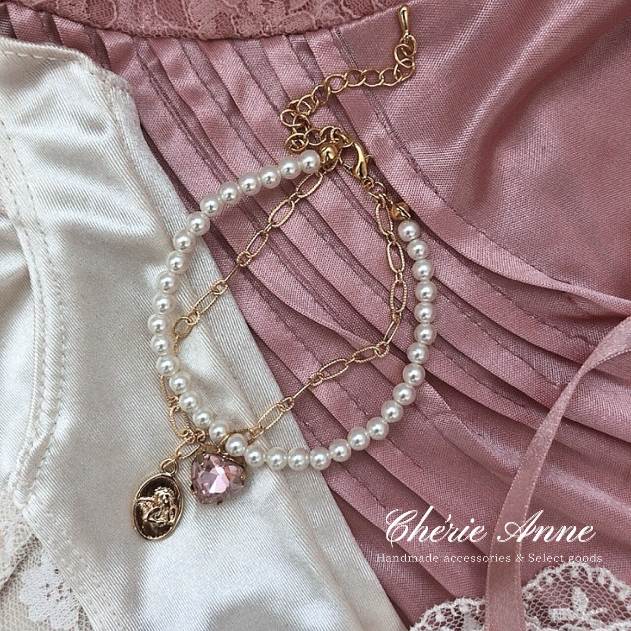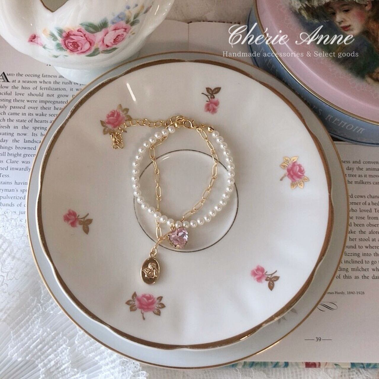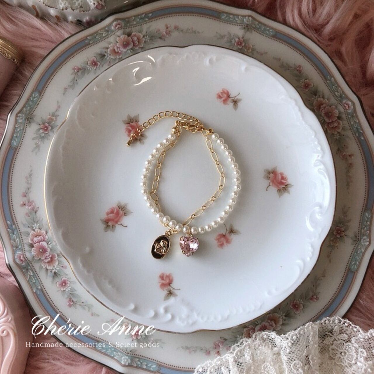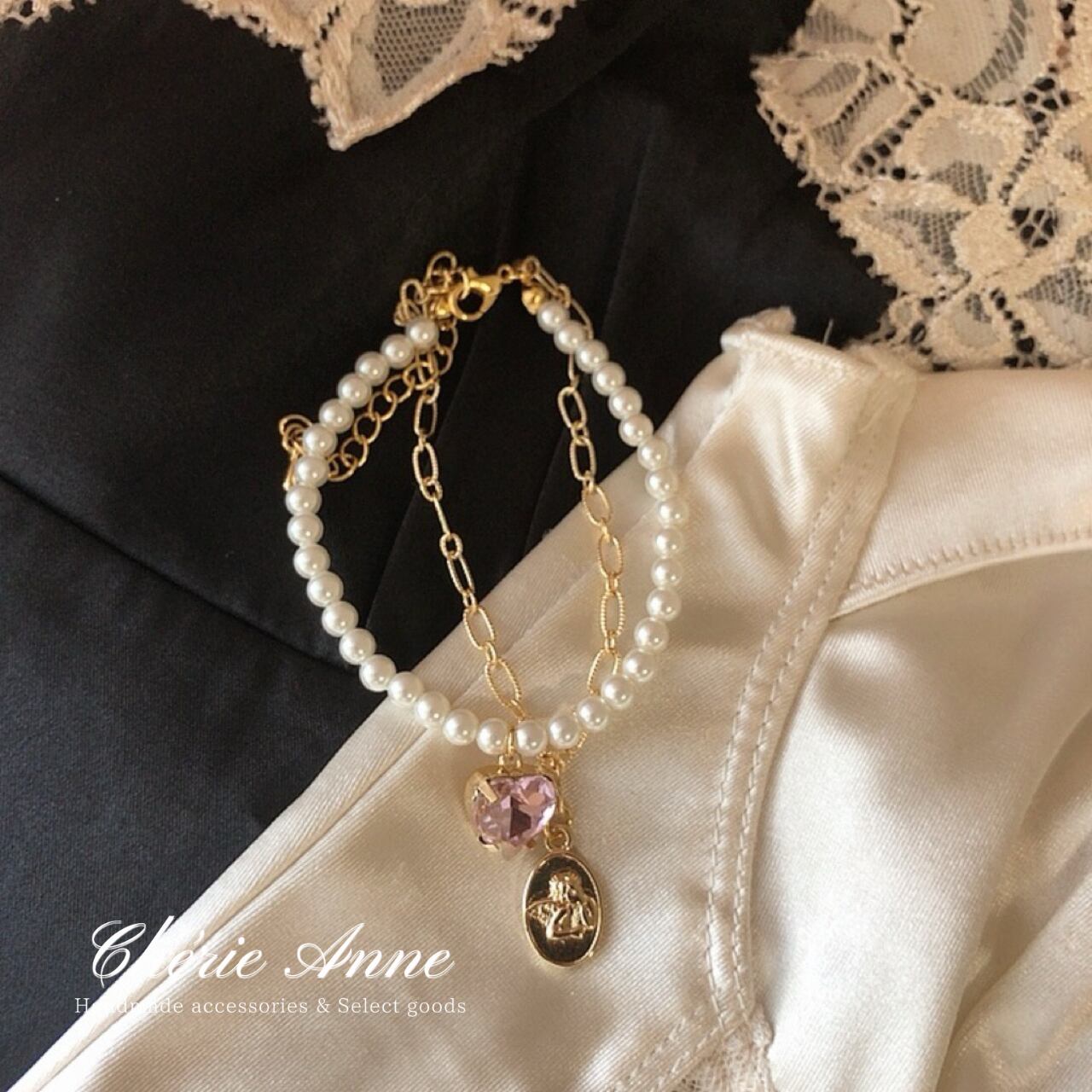 パールとチェーンが織りなすエンジェルハートブレスレット。
