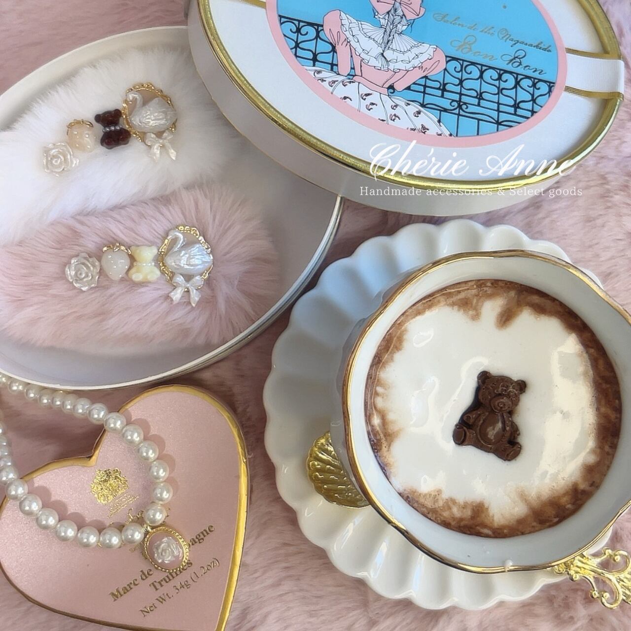 ストロベリーミルクをイメージした優しい色合いの中に、優雅に浮かぶショコラのような薔薇のカメオ。まるで甘い香りが漂いそうなアイテム。