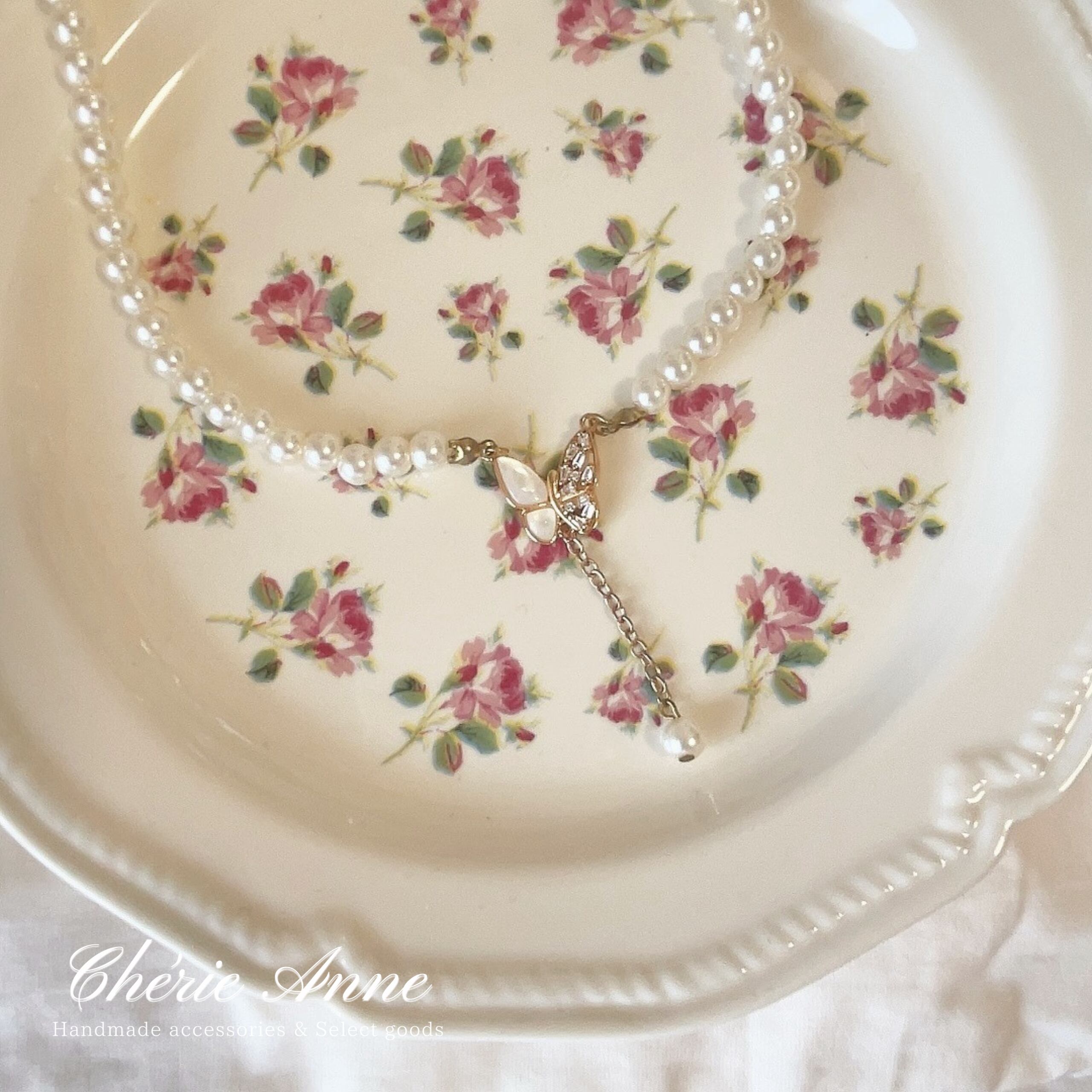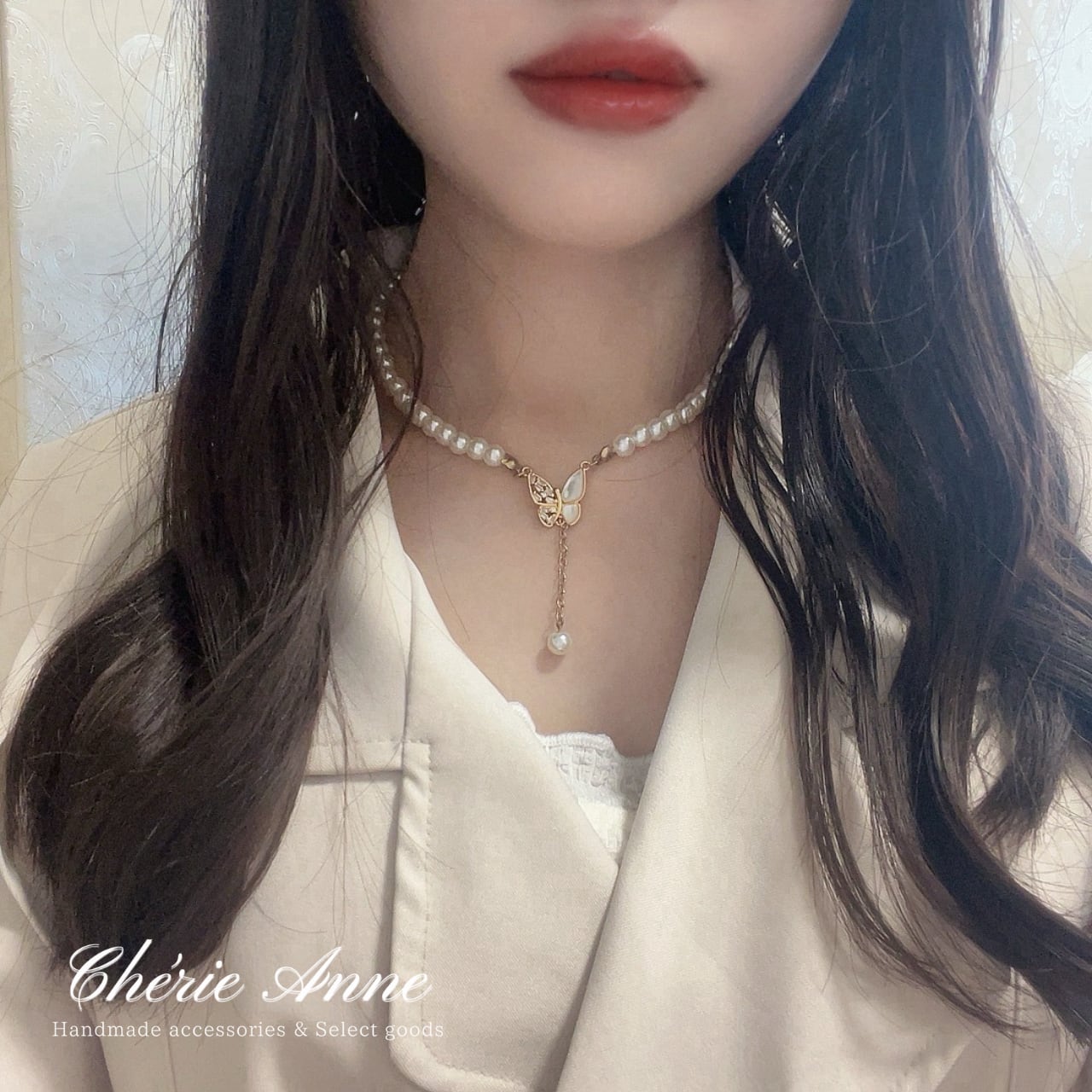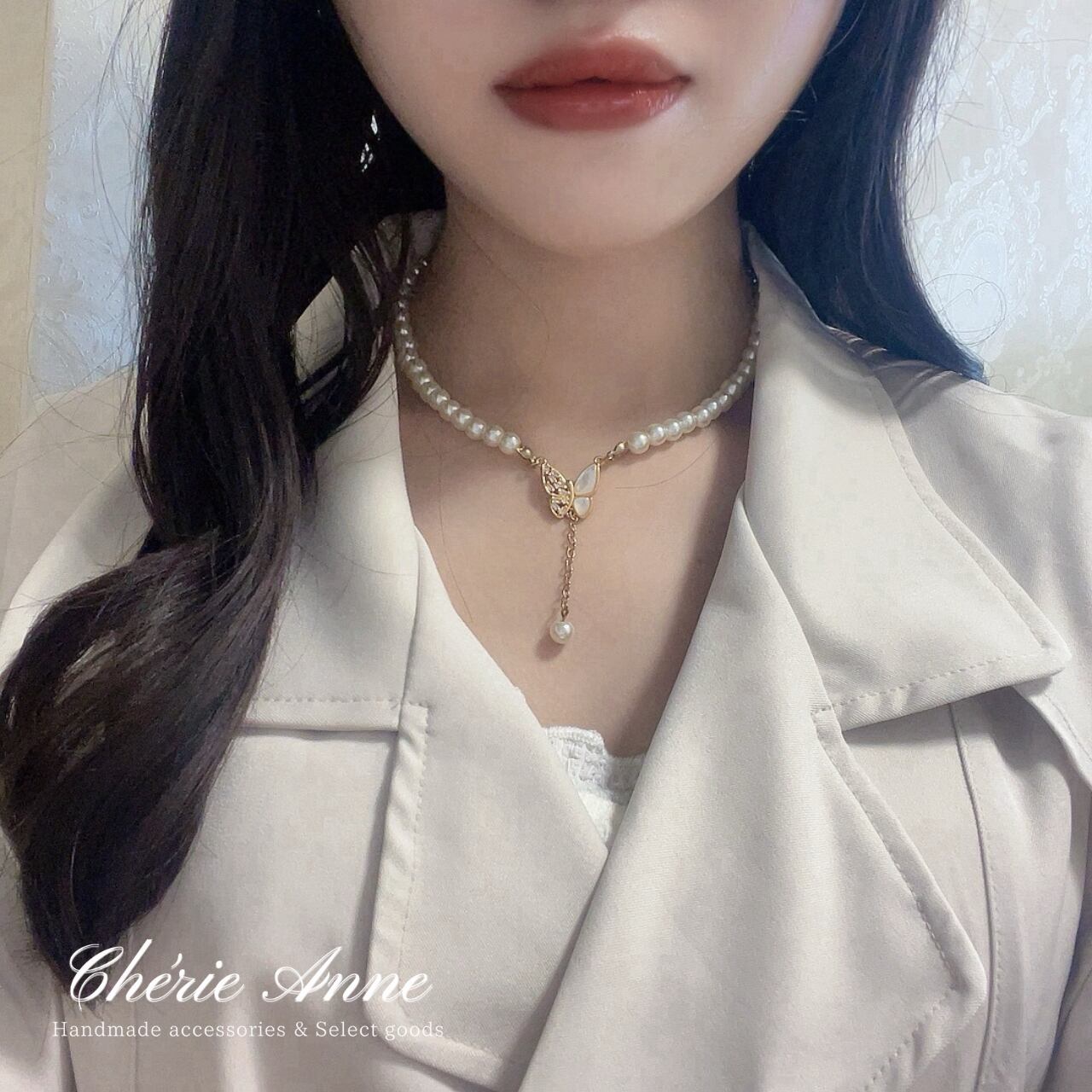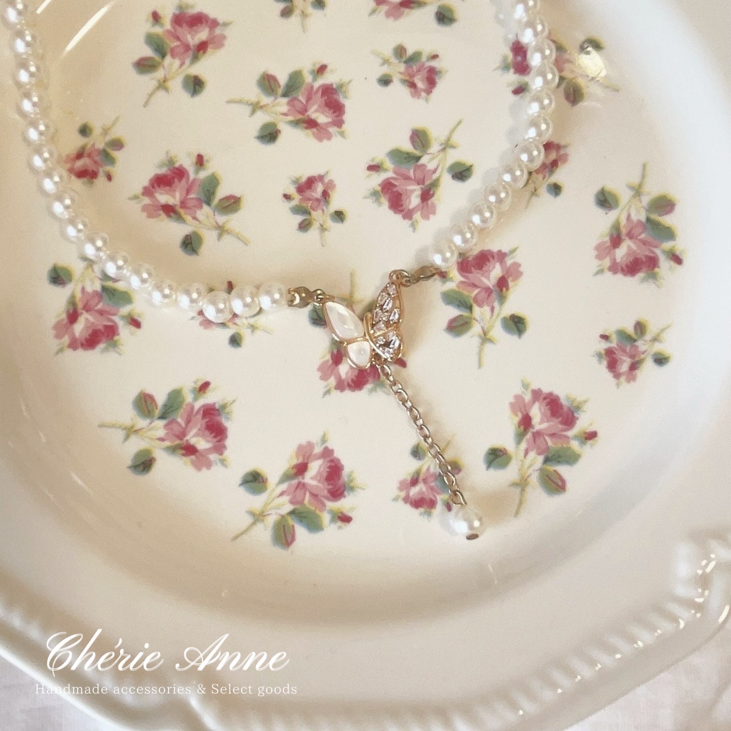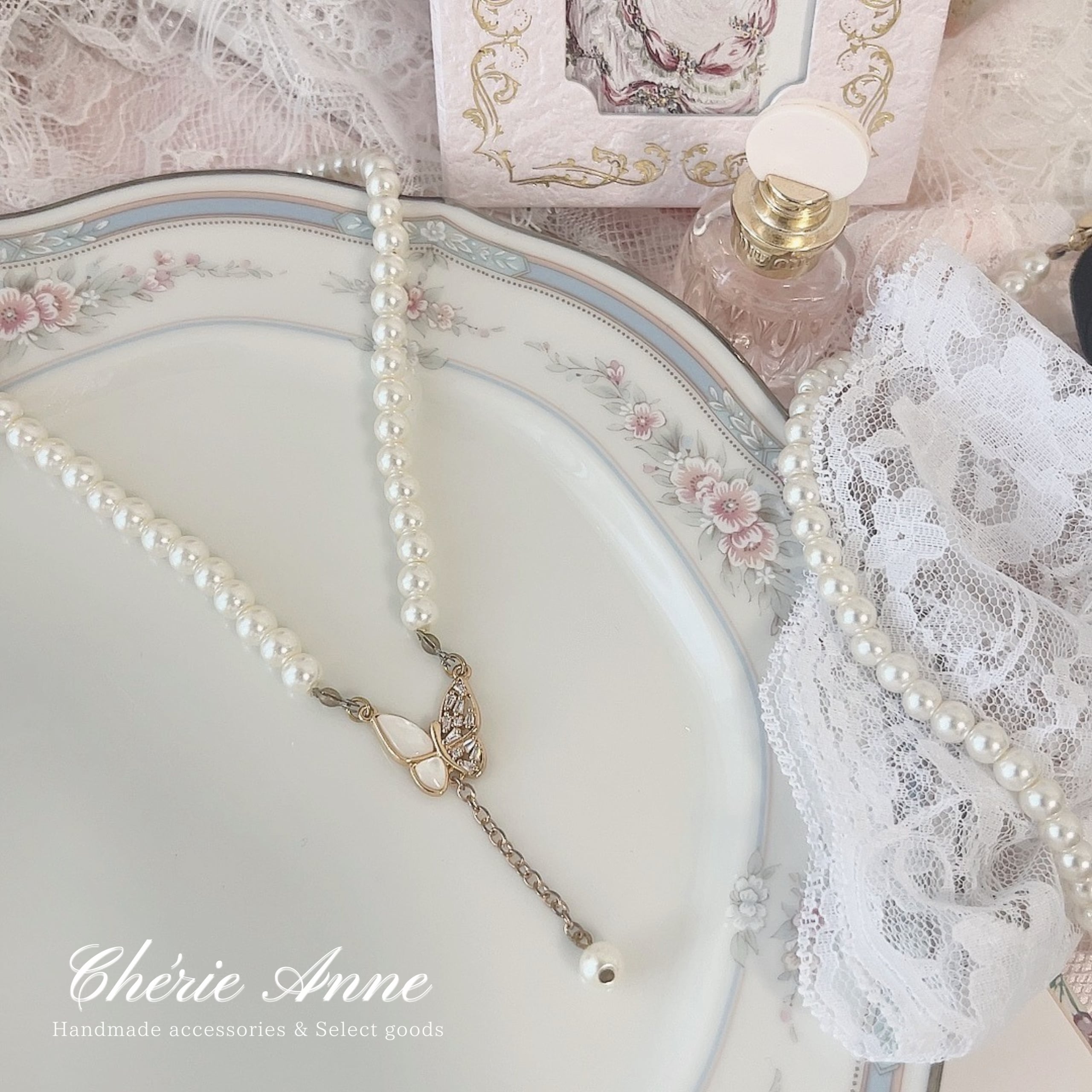 中央の蝶のモチーフと垂れたパールが印象的で華やかな雰囲気のネックレス。