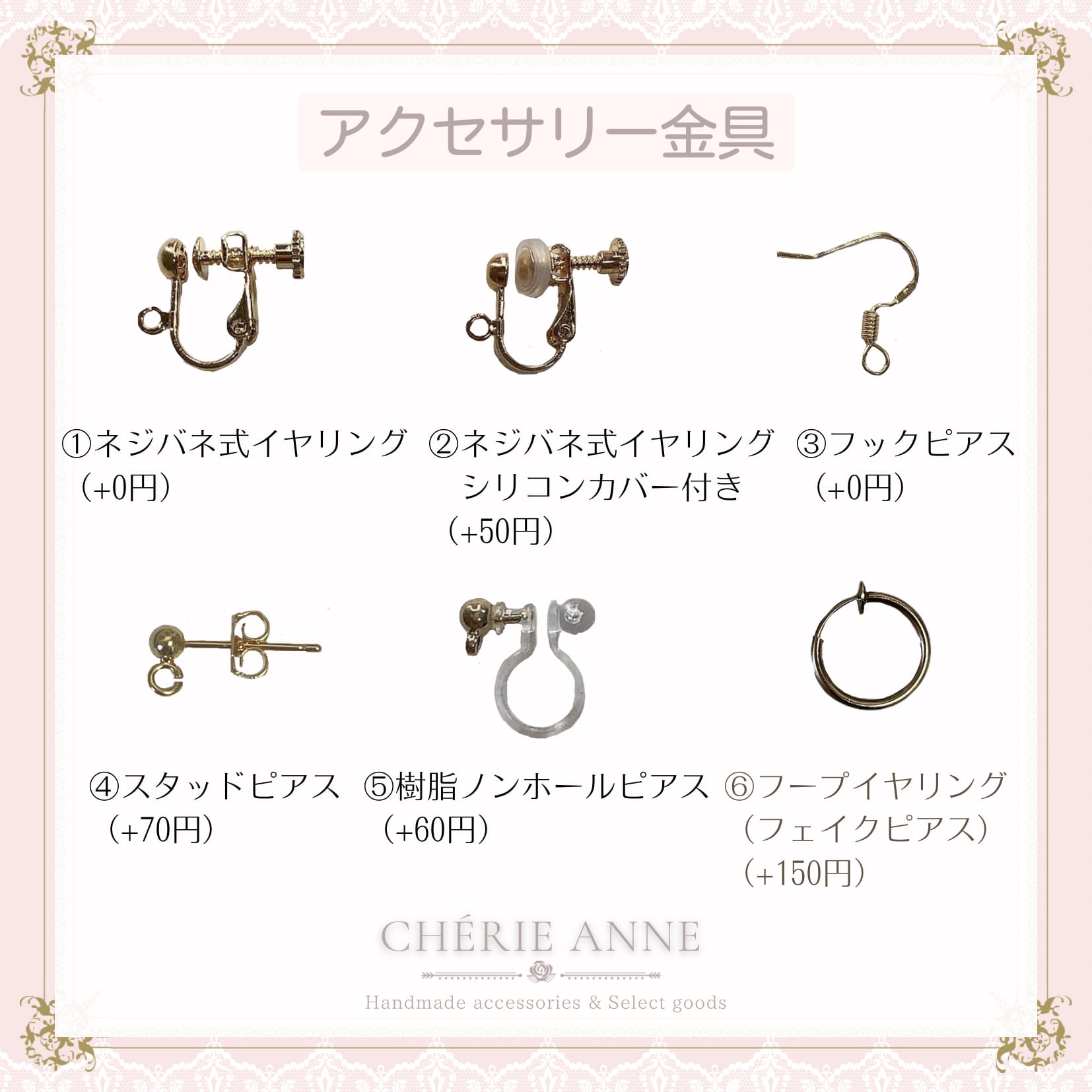 ※選択のない場合は①ネジバネ式イヤリング(+0円)で発送いたします。