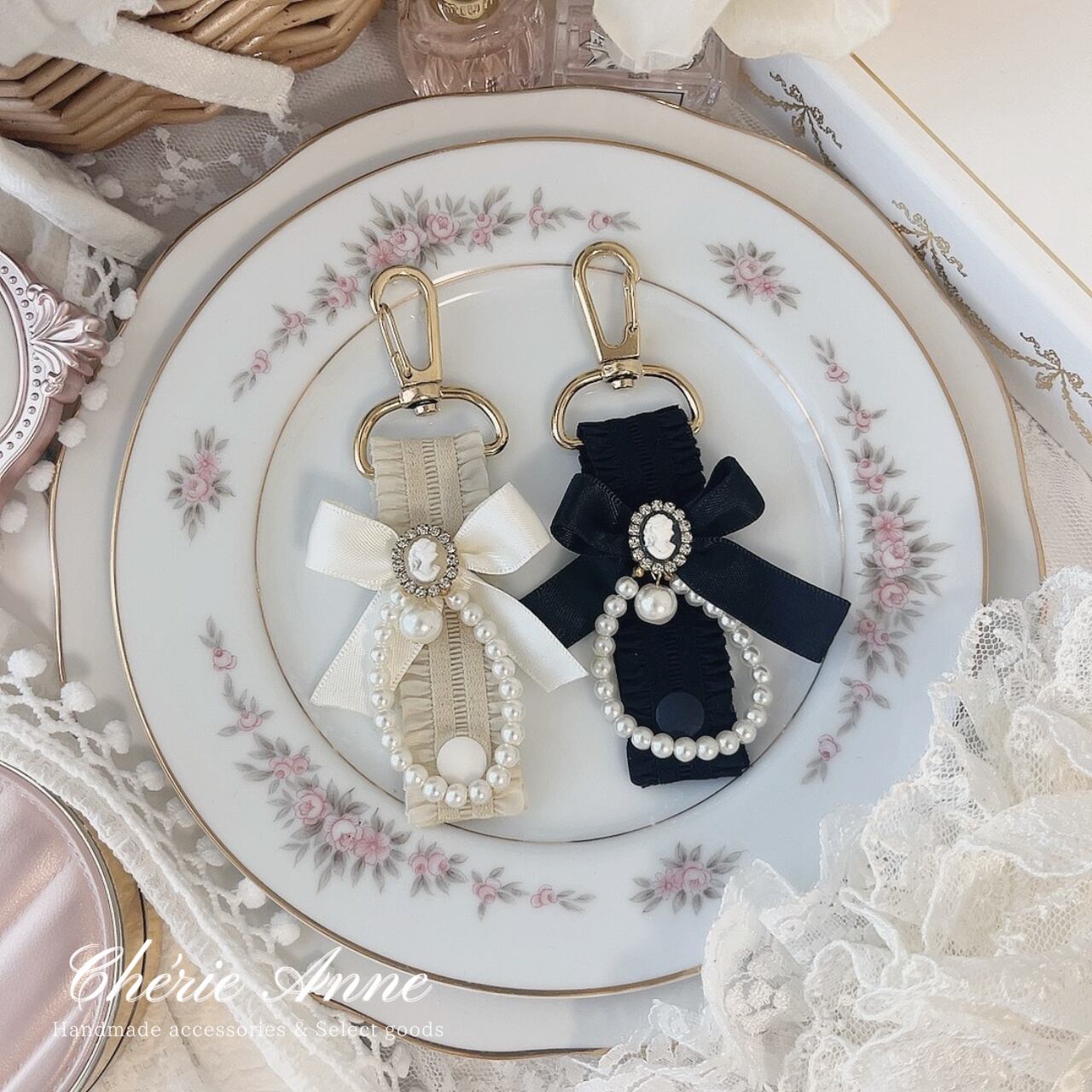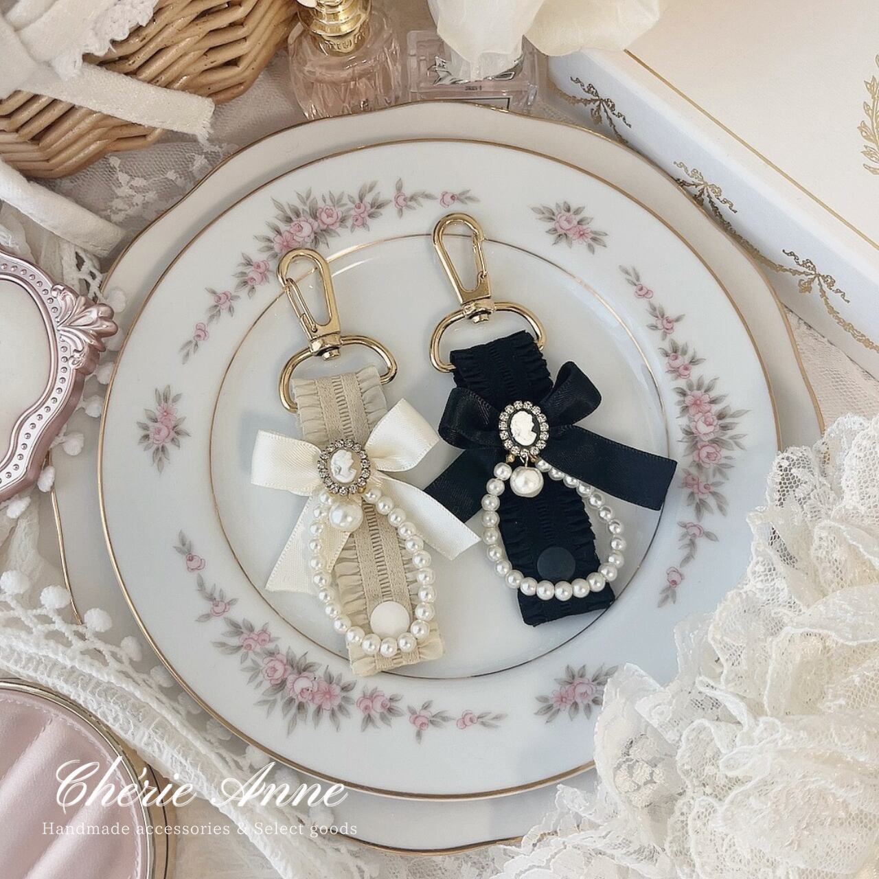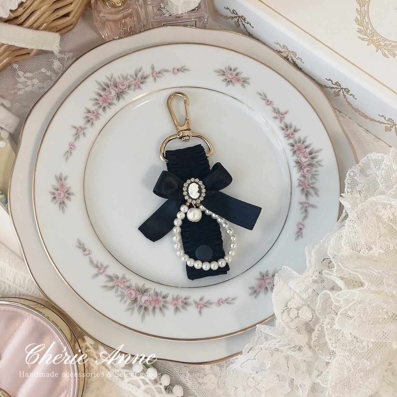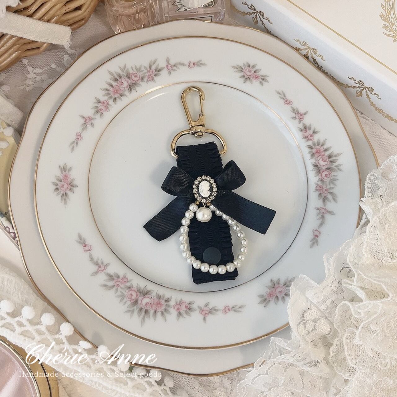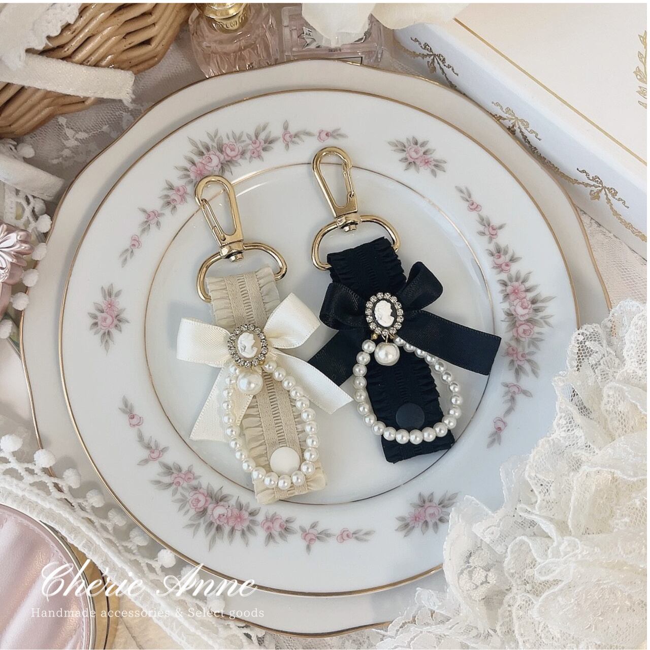 柔らかい風合いのレースとリボンのディテールが魅力的。中央のカメオや揺れるパールも上品ガーリーに仕上げました。